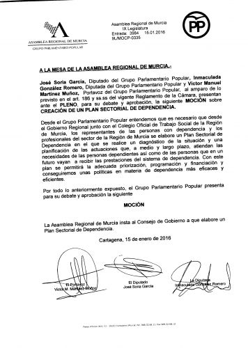 La diputada del grupo parlamentario popular, Inmaculada González, ha presentado una moción en la Asamblea Regional en la que insta al Gobierno regional a elaborar un Plan Sectorial de Dependencia que ayude a establecer un diagnostico de la situación y sirva para planificar actuaciones a medio y largo plazo.