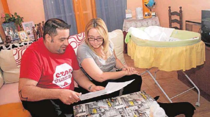 Foto: Paco y Manuela revisando los papeles que deben presentar al banco para negociar la dación en pago, al fondo, su hija en la cuna. :: J. C. Caval