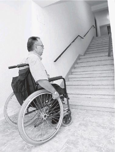 Foto: Una persona en silla de ruedas, ante unas escaleras de un edificio del barrio de San Antón de Murcia sin ascensor. :: FRAN MANZANERA / AGM