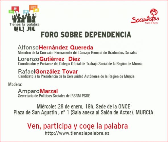 El Colegio, invitado por el PSOE Región de Murcia, participa en el foro sobre dependencia. La participación se centró en el análisis de los datos del II Informe Técnico presentado el pasado noviembre, en las necesidades y en las propuestas de mejora.