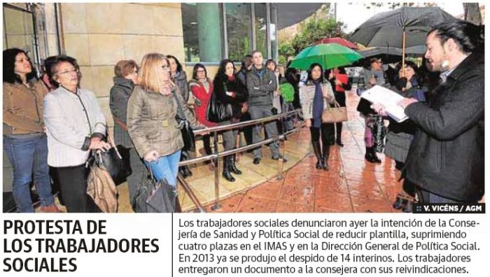 Recientemente se ha conocido la supresión de cuatro plazas de Trabajo Social en la estructura regional. Ello, en contra del criterio del Colegio que se manifestó mediante una concentración para presentar un escrito que analizaba la situación social, las necesidades y propuestas.