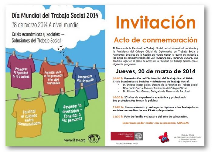 El Decano de la Facultad de Trabajo Social de la Universidad de Murcia y la Presidenta del Colegio Oficial de Diplomados en Trabajo Social y Asistentes Sociales de la Región de Murcia tienen el gusto de invitarle a los actos de conmemoración del DÍA MUNDIAL DEL TRABAJO SOCIAL, que tendrán lugar en el salón de actos de la Facultad de Trabajo Social, con el siguiente programa: