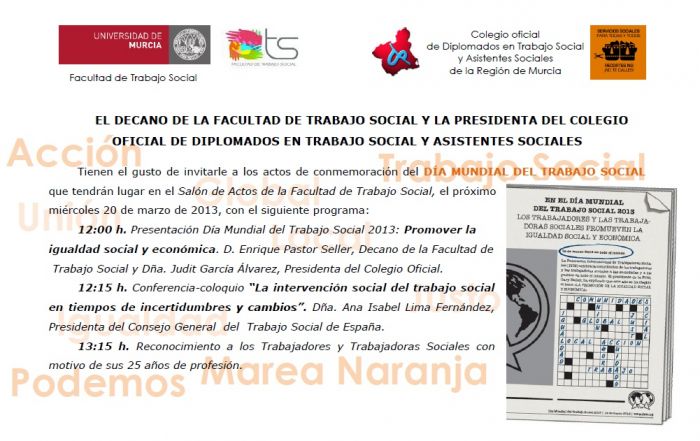 Invitación a los actos de conmemoración del Día Mundial del Trabajo Social, en el salón de actos de la Facultad de Trabajo Social, el próximo 20 de marzo de 2013 a las 12:00 h.