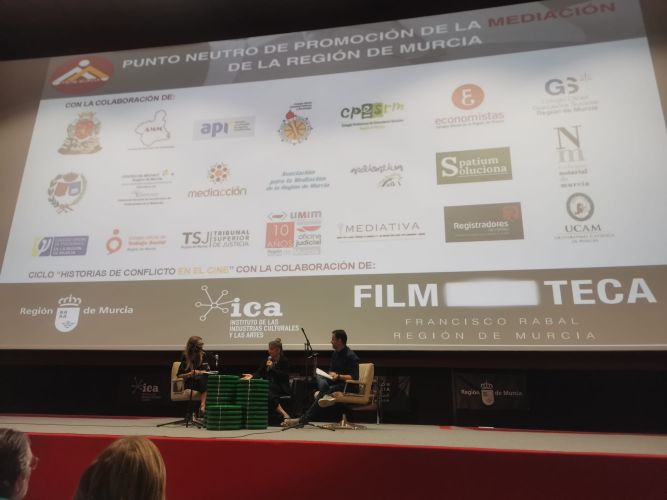 El 10 de octubre se ha proyectado en la Filmoteca la película “Disco, Ibiza, Locomía”, en el marco del ciclo de mediación que se lleva a cabo a través del cineforum organizado por el Punto Neutro de Promoción de la Mediación para la Región de Murcia (PNPM). Asistiendo en representación del Colegio, Dña. Iluminada Pardo Cayuela, Vicepresidenta de la Junta de Gobierno.