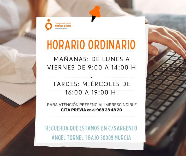 Os recordamos que el Colegio, según Convenio de Colegios Profesionales de la Región de Murcia, inicia su jornada intensiva a partir del 1 de junio hasta el 15 de septiembre de 2023.