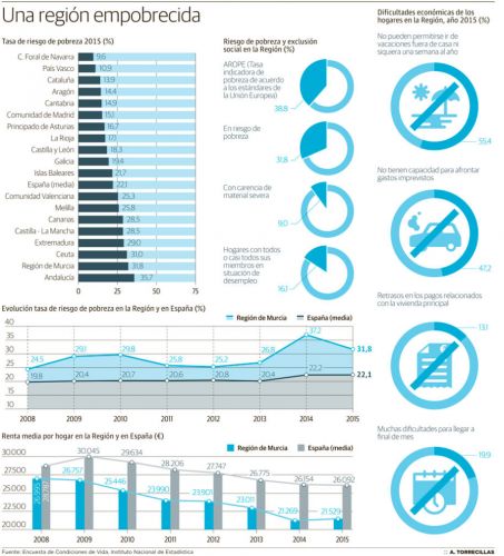 Murcia es, de acuerdo a este informe, la segunda región más empobrecida de toda España, solo por detrás de Andalucía. En concreto, el 31,8% de los murcianos disponen de ingresos inferiores a las cantidades que el INE establece como límite a partir del cual se puede hablar de ‘riesgo de pobreza’: 8.019 euros anuales en el caso de un hogar formado por una sola persona, o 16.822 euros en una familia de dos adultos y dos menores (estas cifras se calculan cada año a partir de la evolución de las rentas medias en España). Andalucía, donde el 35,7% de la población cuenta con ingresos inferiores a estas cantidades, se sitúa a la cabeza en los indicadores de exclusión.
