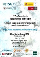 Las Conferencias Locales de Trabajo Social con Grupos son eventos colaborativos en torno al trabajo con grupos. Reúnen a profesionales de trabajo con grupos, docentes universitarios, representantes de colegios profesionales, responsables institucionales, usuarios/as de los servicios, estudiantes e investigadores/as con el objetivo localizar y caracterizar iniciativas de trabajo con grupos, desarrollar instrumentos para la práctica profesional con grupos, compartir experiencias y mejorar el conocimiento de todos los participantes. Las conferencias también persiguen presentar la lógica del proyecto TSG+ que promueve las conferencias. Esta es la quinta conferencia que se celebra en España y la primera en la ciudad de Murcia.