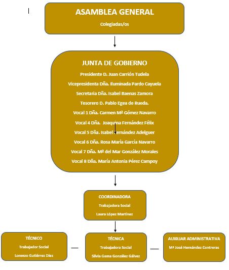 Gerencia/ Coordinadora. Trabajadora Social: Dña. Laura López Martínez. Funciones: dirección y coordinación (institucional y coordinación personal empleado), deontología, transparencia. Responsable Canal de Denucnias. Responsable Vocalías de Salud - Emergencias, Refugiados e Inmigración - Justicia, Mediación, Penitenciario, Coord. Parental y Deontología - Infancia y familia, Violencia de Género y Trabajo Social Internacional.