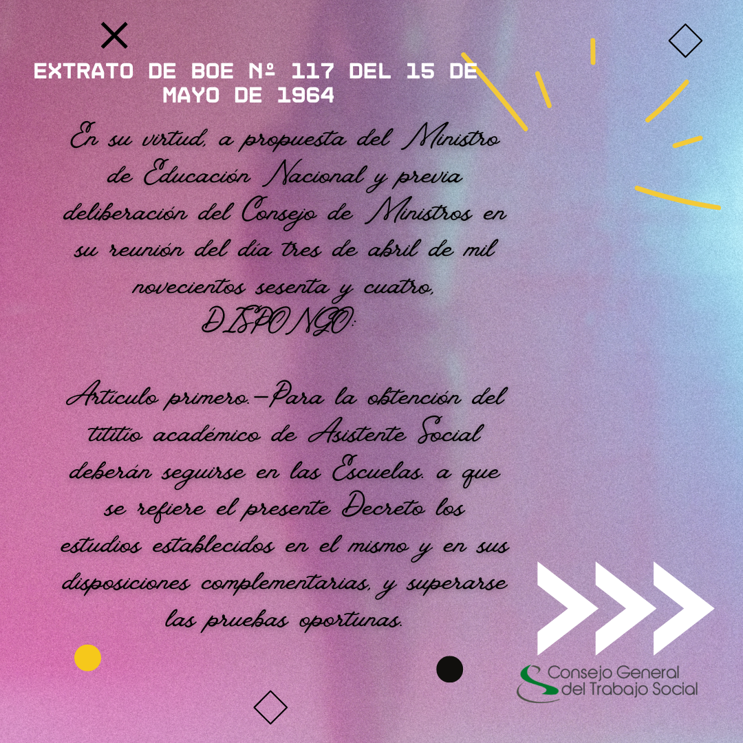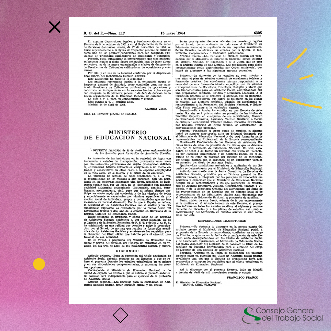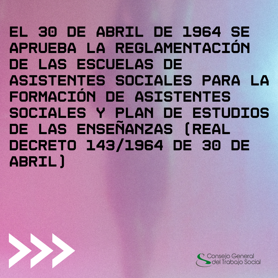 El 30 de abril de 1964 se aprobaba la Reglamentación de las Escuelas de Asistentes Sociales para la formación de Asistentes Sociales y Plan de estudios de las enseñanzas (Real Decreto 143/1964 de 30 de abril).