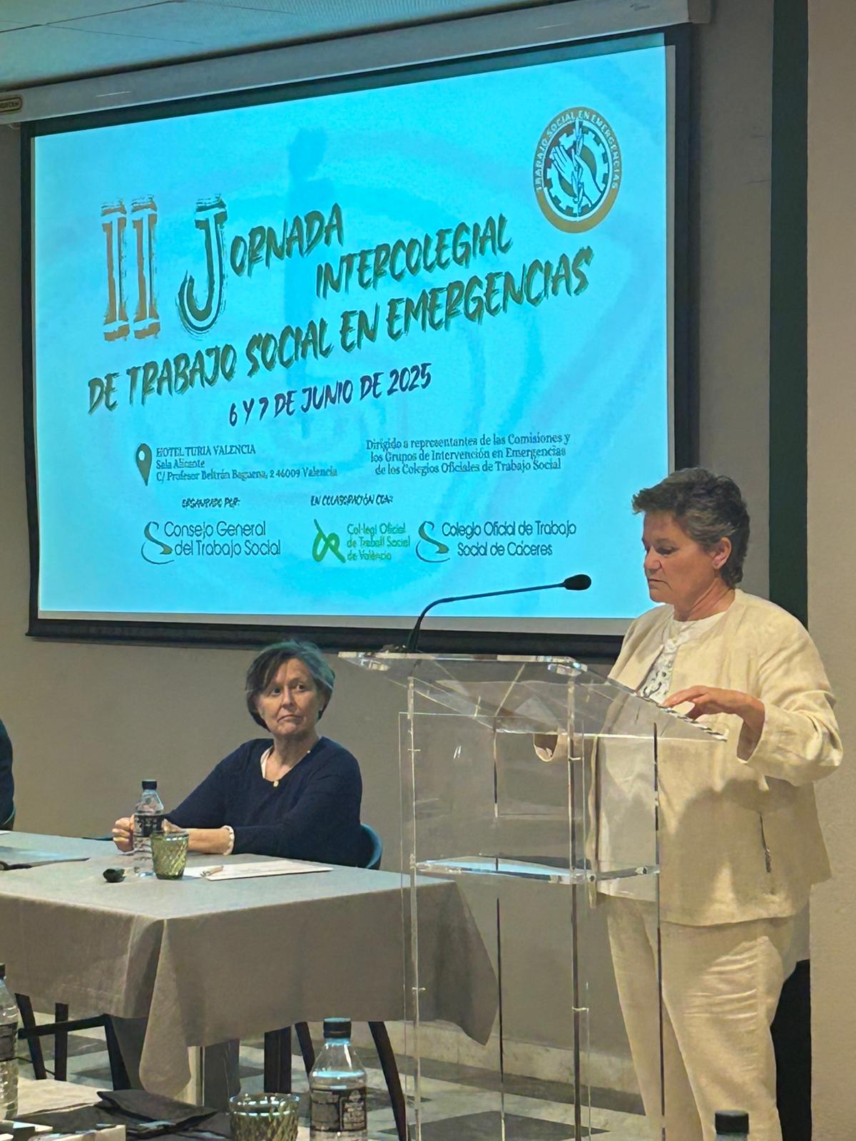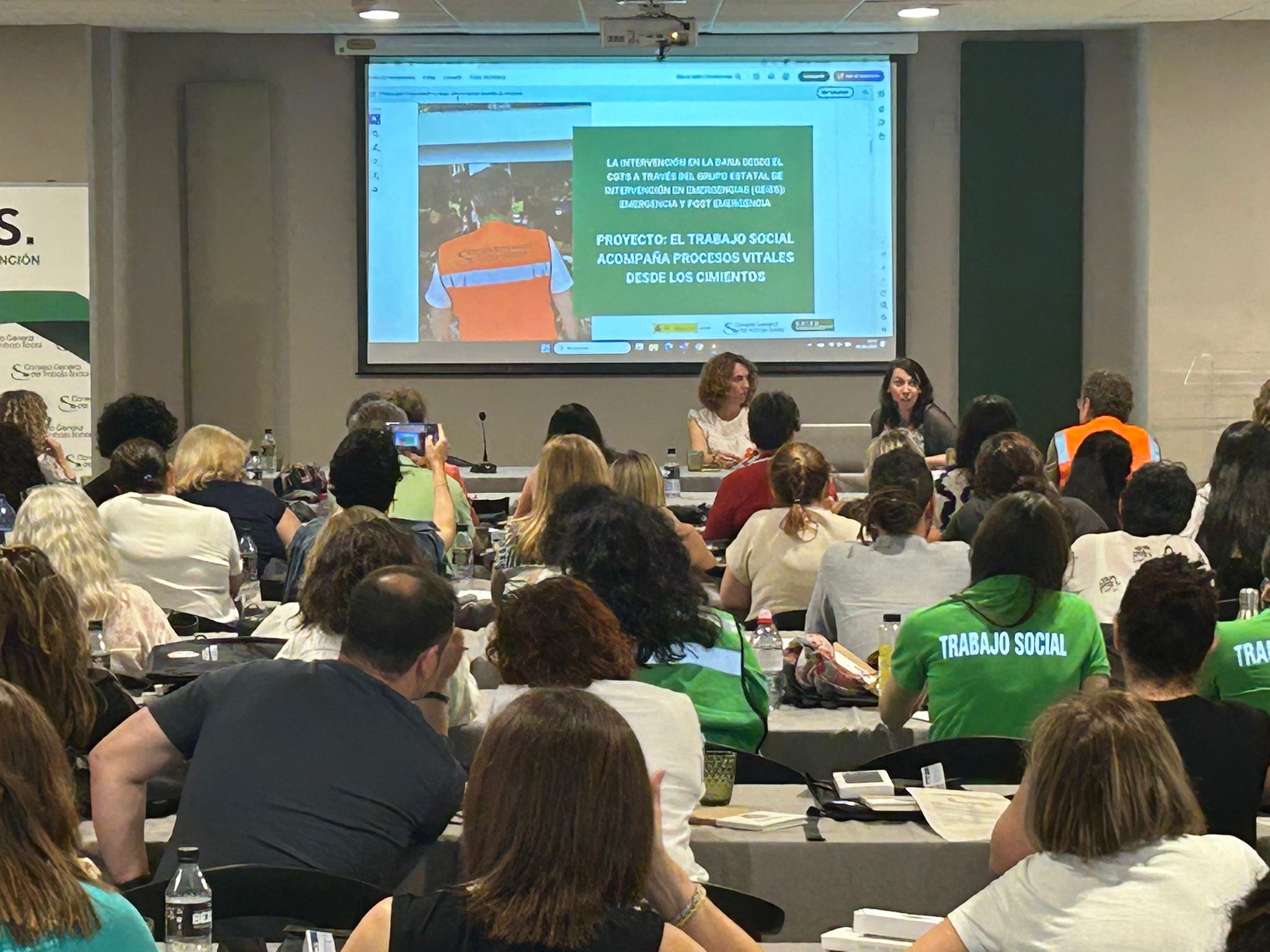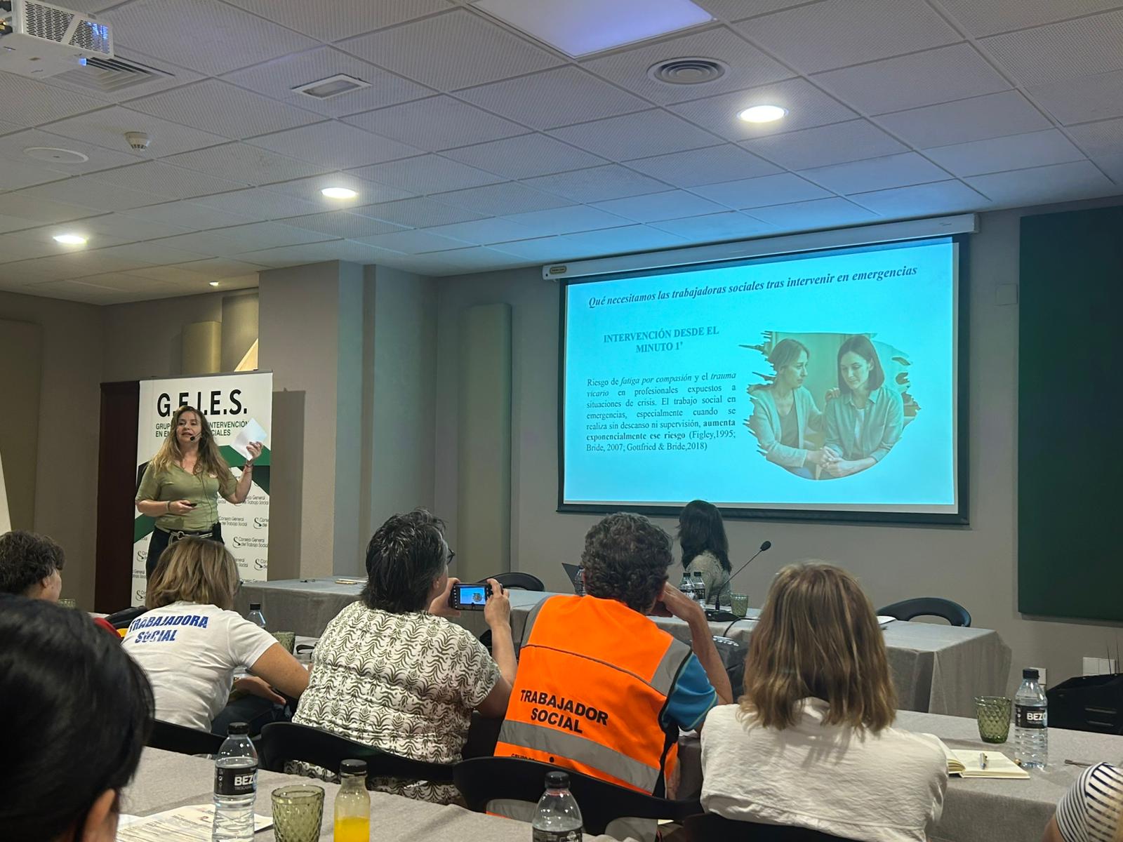 Emi Vicente resumió los más de 20 años que, desde el Consejo General y los 36 Colegios Oficiales “venimos trabajando en el ámbito de las emergencias”, pero también informó de la actuación del GEIES hace casi 8 meses en Valencia, junto con el Colegio profesional para acompañar a los Servicios Sociales municipales y a la población en general ante los daños ocasionados por la DANA del 29 de octubre, que afectó a las provincias de Valencia, Cuenca, Albacete y Málaga.