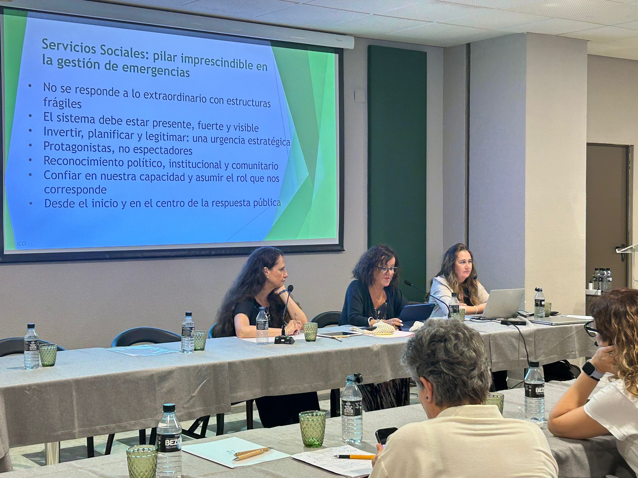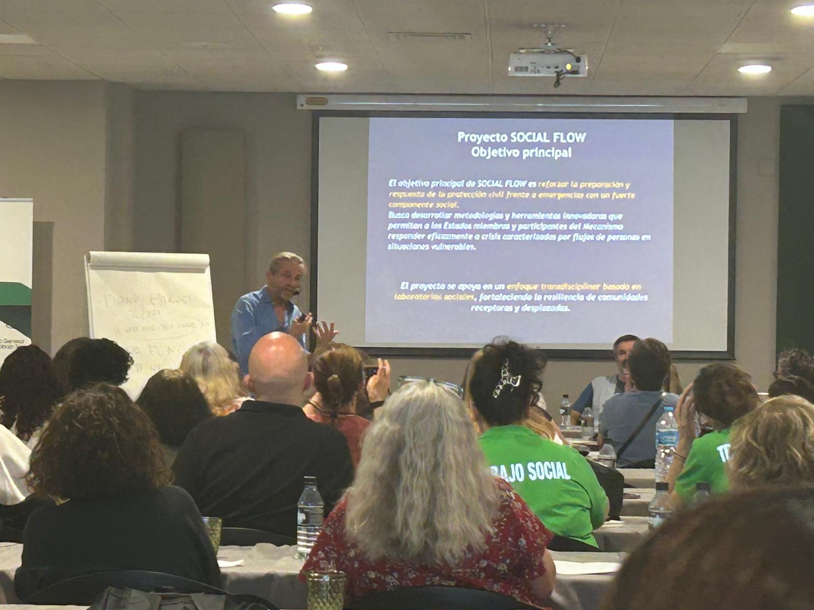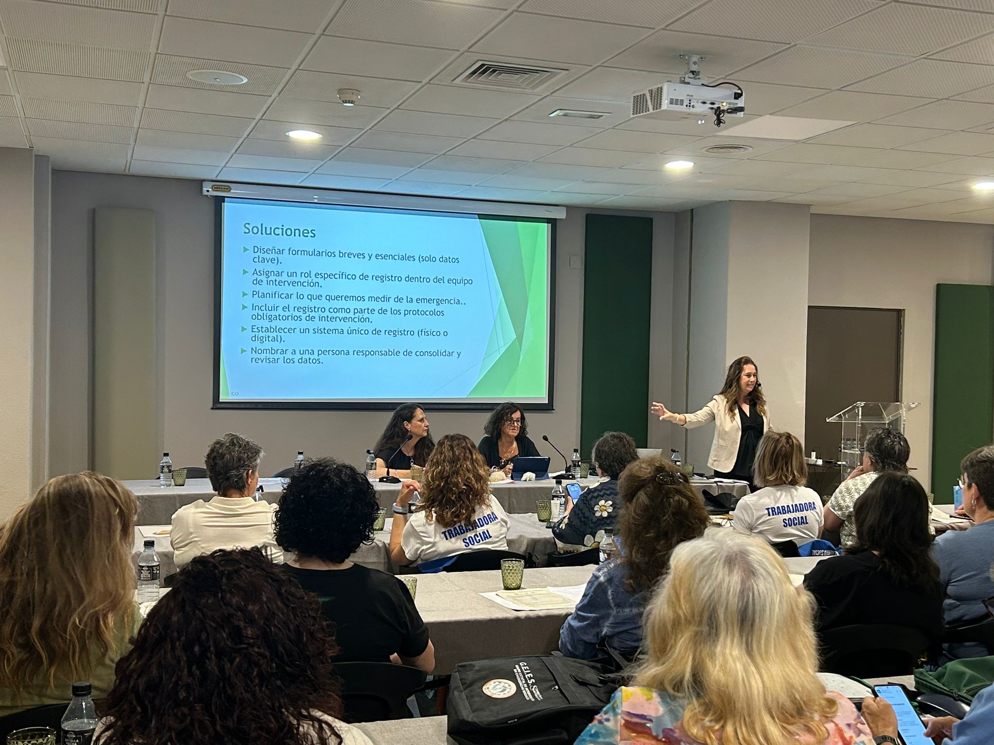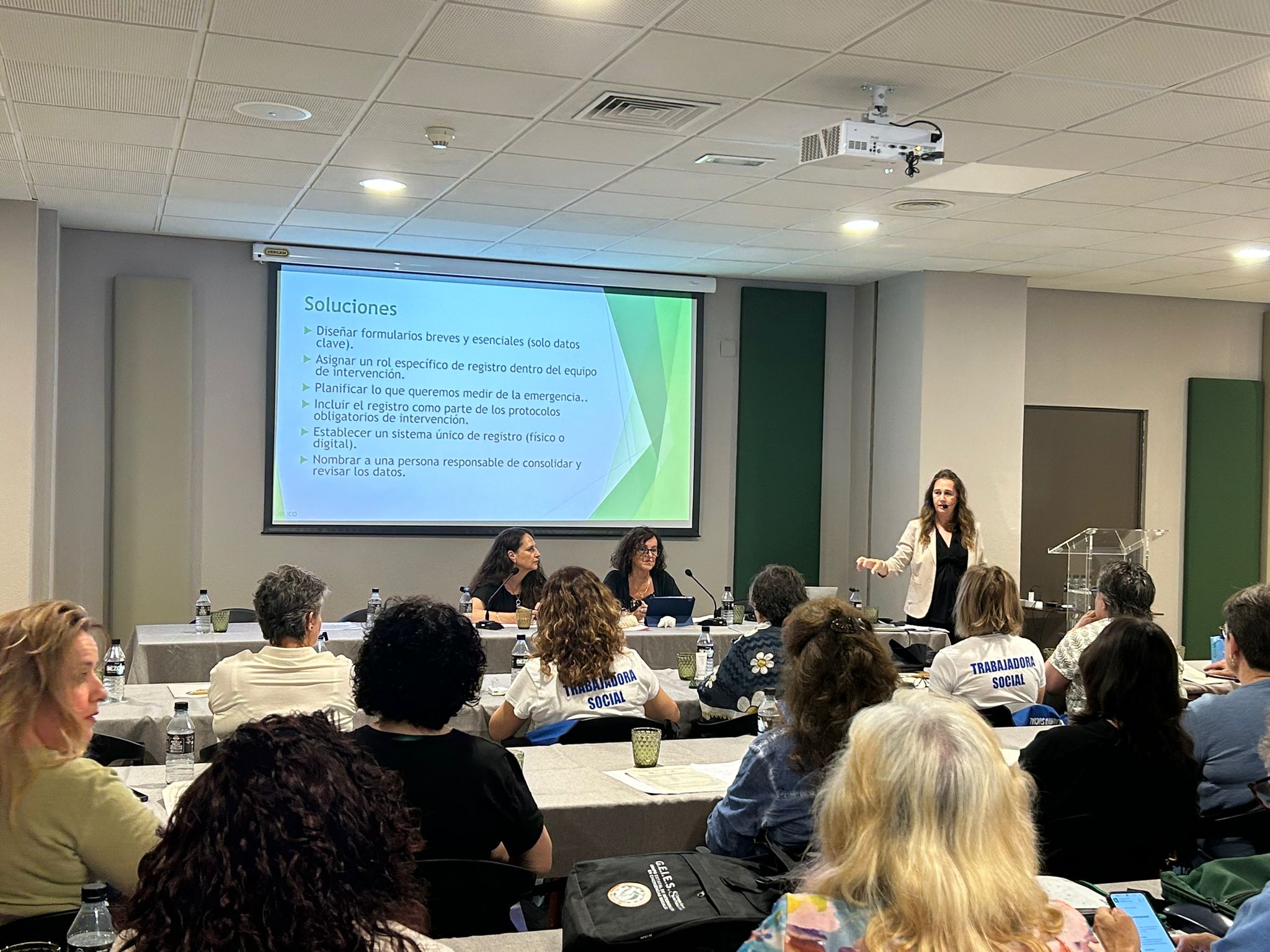 Emi Vicente resumió los más de 20 años que, desde el Consejo General y los 36 Colegios Oficiales “venimos trabajando en el ámbito de las emergencias”, pero también informó de la actuación del GEIES hace casi 8 meses en Valencia, junto con el Colegio profesional para acompañar a los Servicios Sociales municipales y a la población en general ante los daños ocasionados por la DANA del 29 de octubre, que afectó a las provincias de Valencia, Cuenca, Albacete y Málaga.