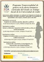 Los próximos días 25, 26 y 27 de mayo tendrán lugar los Seminarios 2, 3 y 4 del Programa TRANSVERSALIDAD DE GÉNERO EN LA OFERTA FORMATIVA CURRICULAR DEL GRADO EN TRABAJO SOCIAL DE LA UNIVERSIDAD DE CÁDIZ, organizado por el Área de Trabajo Social, Departamento de Derecho del Trabajo y de la Seguridad Social y con la colaboración del Instituto de la Mujer, Facultad de Ciencias del Trabajo, Servicio de Extensión Universitaria, Vicerrectorado de Cultura, Unidad de Igualdad, Delegación del Rector para las Políticas de Igualdad y de Inclusión de la Universidad de Cádiz y Colegio Profesional de Trabajo Social de Cádiz.