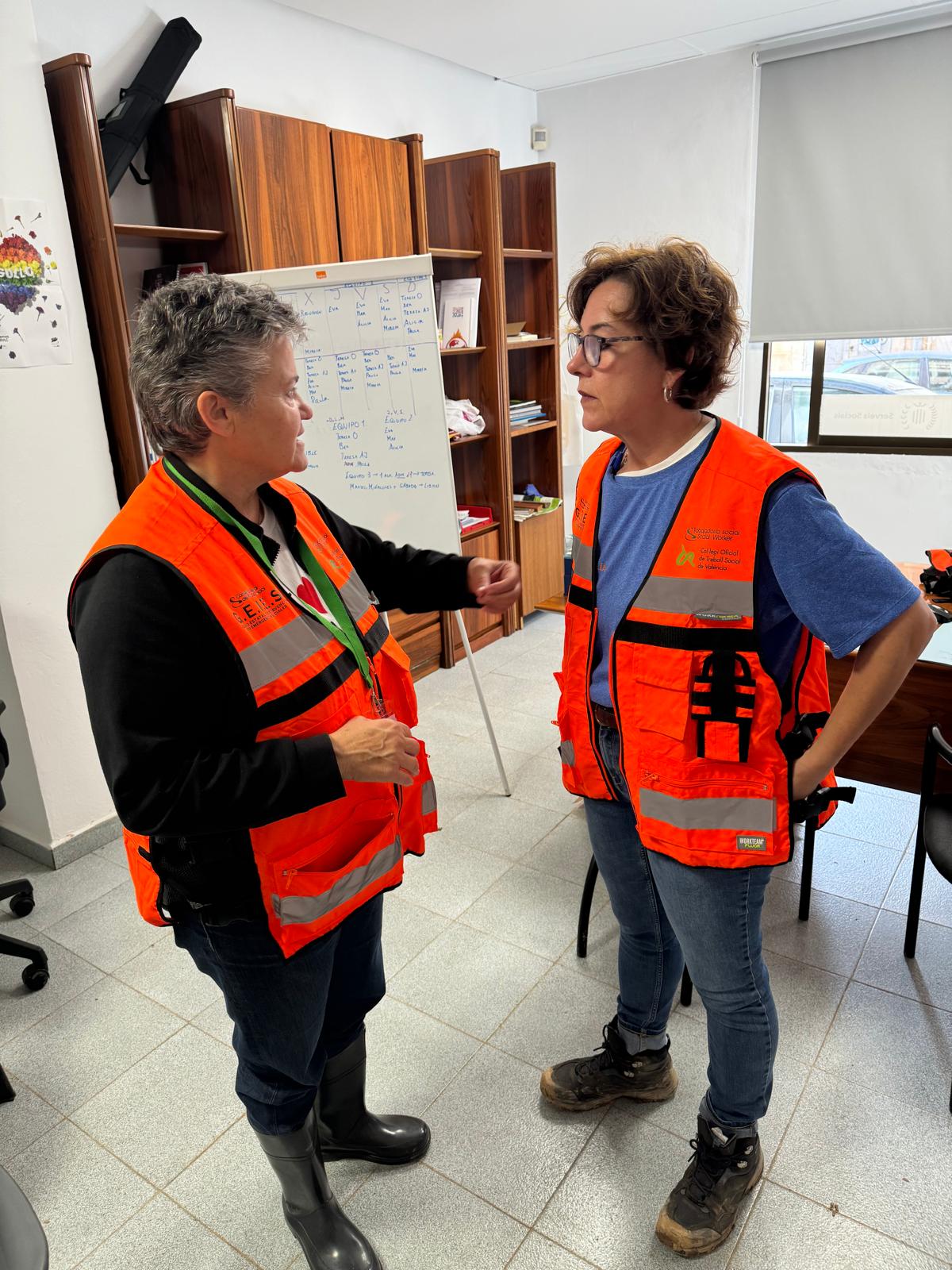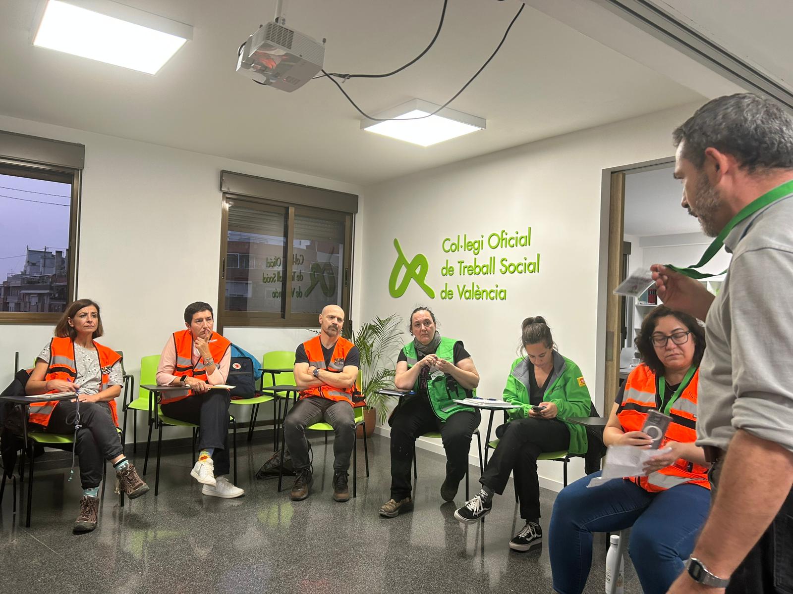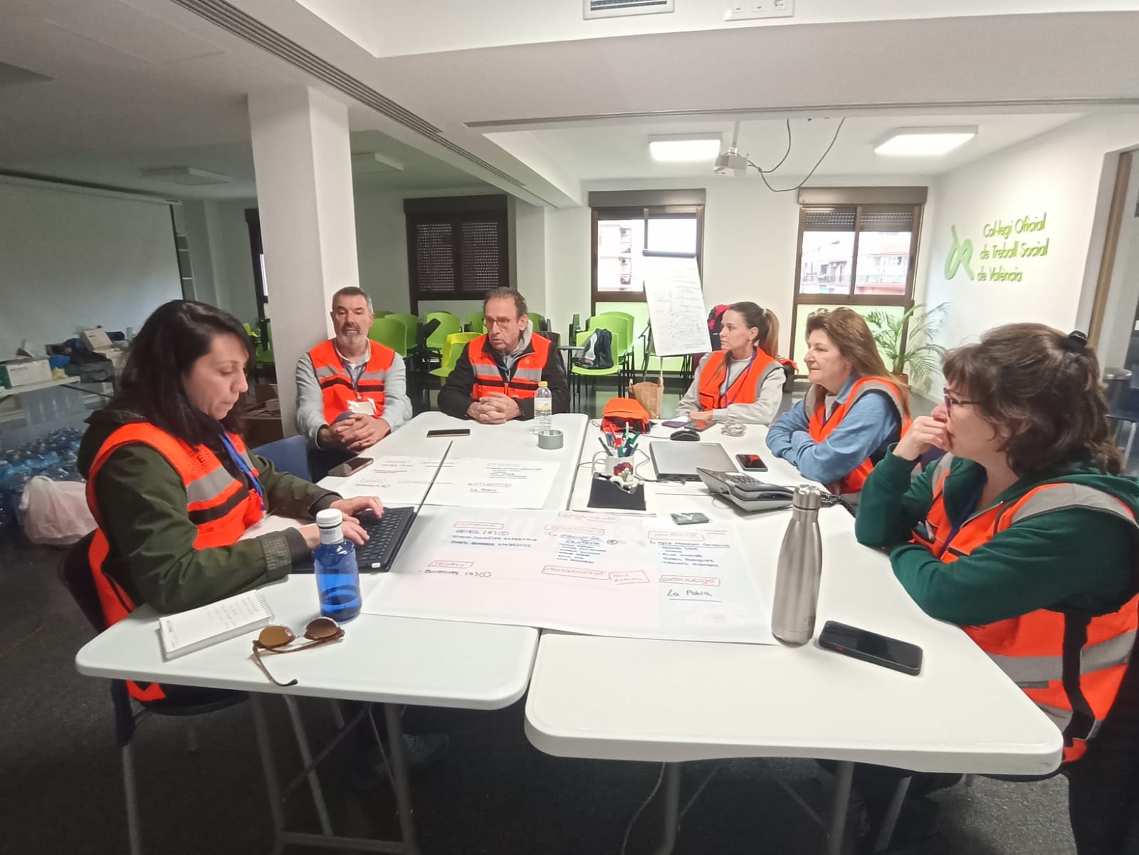Ambos equipos mantuvieron una reunión con el Colegio Oficial de Trabajo Social de Valencia, donde se dio traslado de la situación, las acciones llevadas a cabo por el equipo del Colegio, las necesidades detectadas por las trabajadoras sociales de las zonas afectadas y se distribuyen las poblaciones de actuación. Cada equipo fue asignado a diferentes localizaciones afectadas acompañando a los equipos de los servicios sociales municipales.