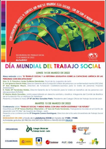 El Colegio Oficial de Trabajo Social de León y la Escuela Universitaria de Trabajo Social de León celebran dos actos conmemorativos por el DÍA MUNDIAL DEL TRABAJO SOCIAL 2022, que tendrán lugar los días LUNES 14 y MARTES 15 DE MARZO DE 2022