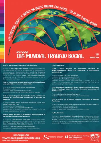 El Colegio Oficial de Trabajo Social de Santa Cruz de Tenerife y el Área de Trabajo Social de la Facultad de Ciencias Sociales y de la Comunicación de La Universidad de La Laguna han organizado la Jornada “Día Mundial del Trabajo Social”, que tendrán lugar el próximo 15 de marzo, en horario de 8:30 a 14:15 horas, de forma presencial en el Aula Magna del Campus de Guajara.