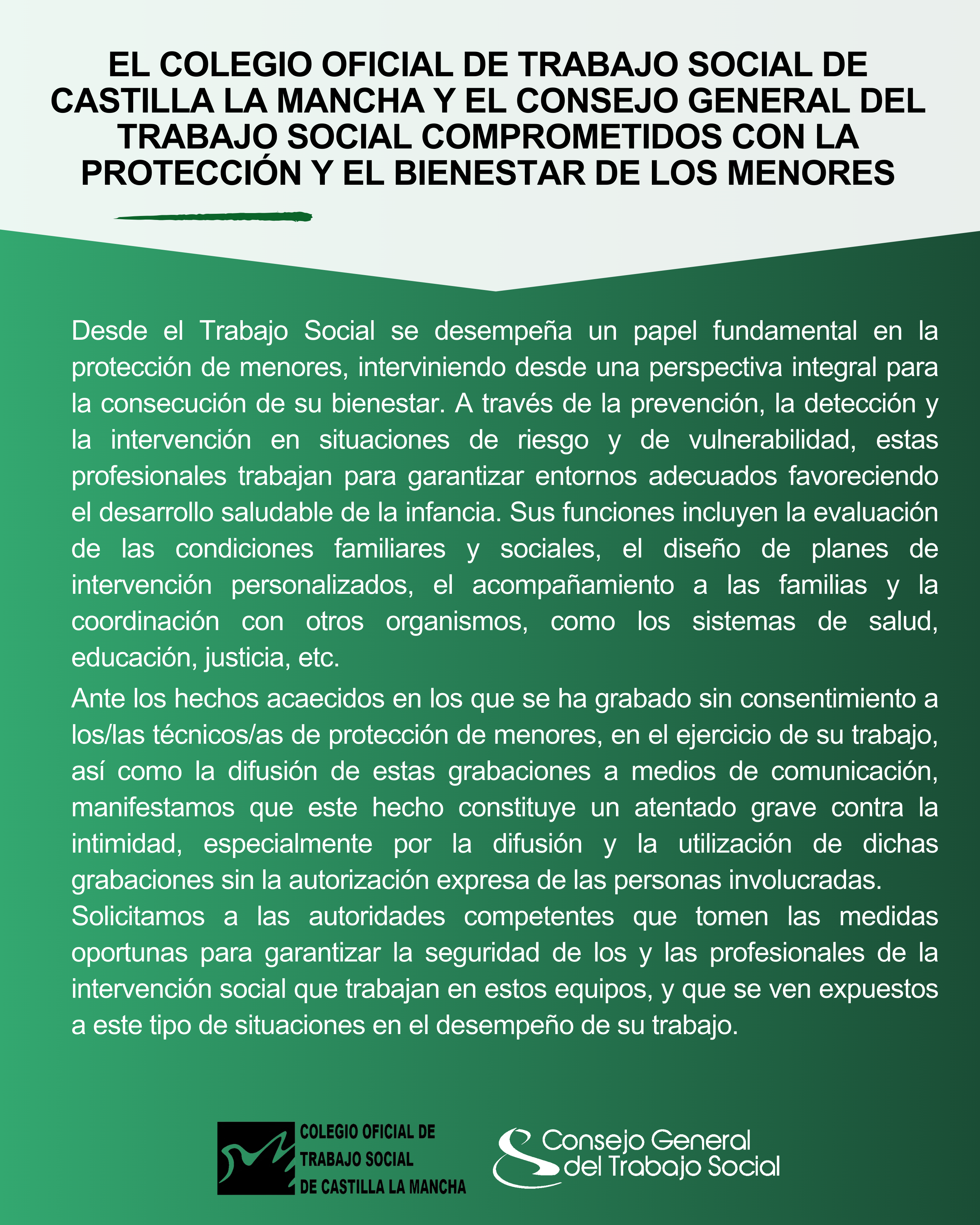 Asimismo, el Colegio Oficial de Trabajo Social de Castilla La Mancha y el Consejo General del Trabajo Social manifestamos nuestro compromiso por un entorno laboral seguro y libre de situaciones violentas. Reivindicamos que la Administración pública actúe en consecuencia para salvaguardar la integridad de estos equipos que día a día realizan su trabajo para garantizar la protección y prevención de posibles situaciones de riesgo, violencia o desprotección en los menores.
