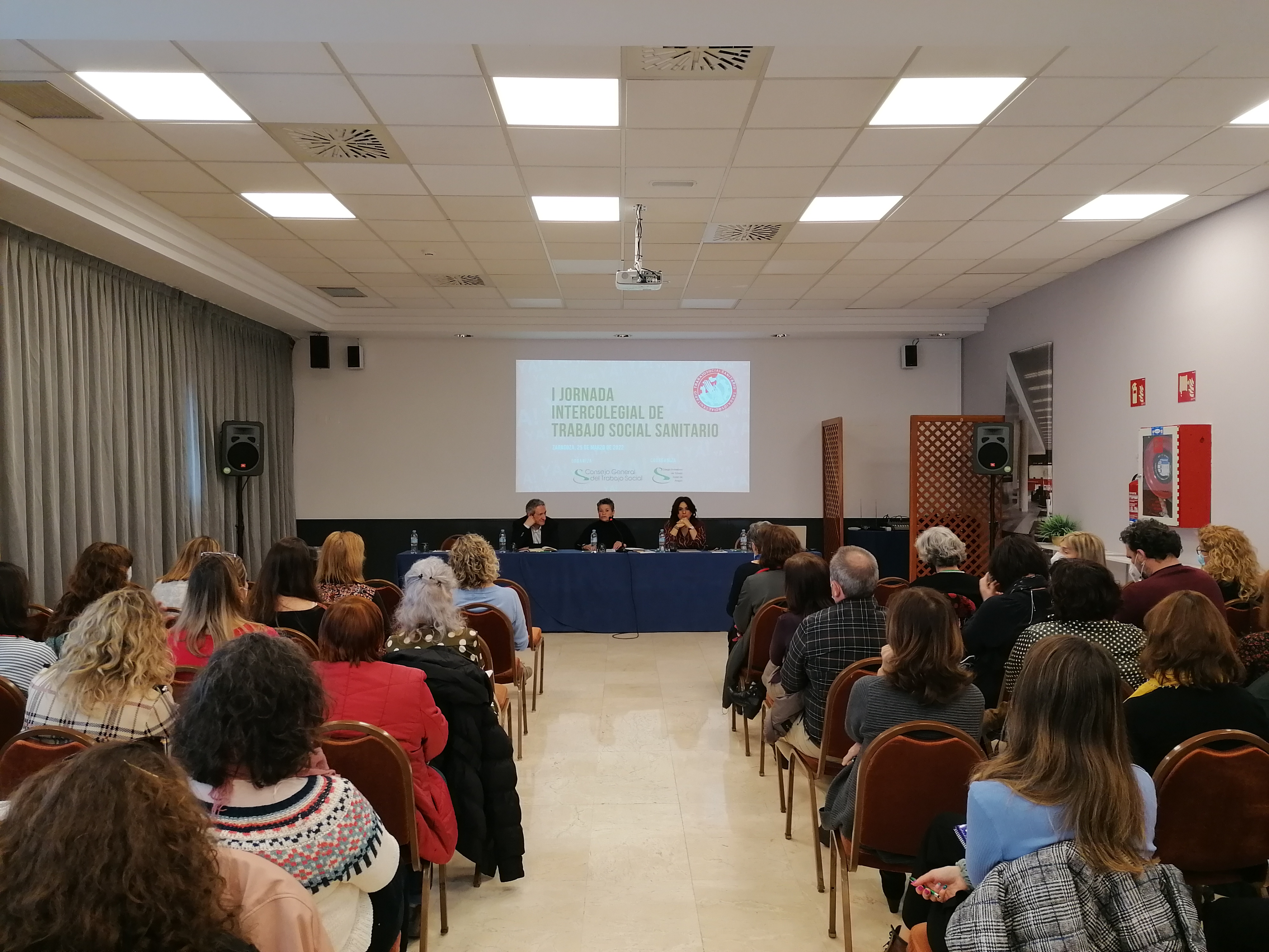 Emi Vicente, presidenta del Consejo General, ha inaugurado la Jornada acompañada de Ana Cristina Sola, presidenta del Colegio Profesional de Trabajo Social de Aragón, y José María Abad, director general de Asistencia Sanitaria del Servicio Aragonés de Salud.