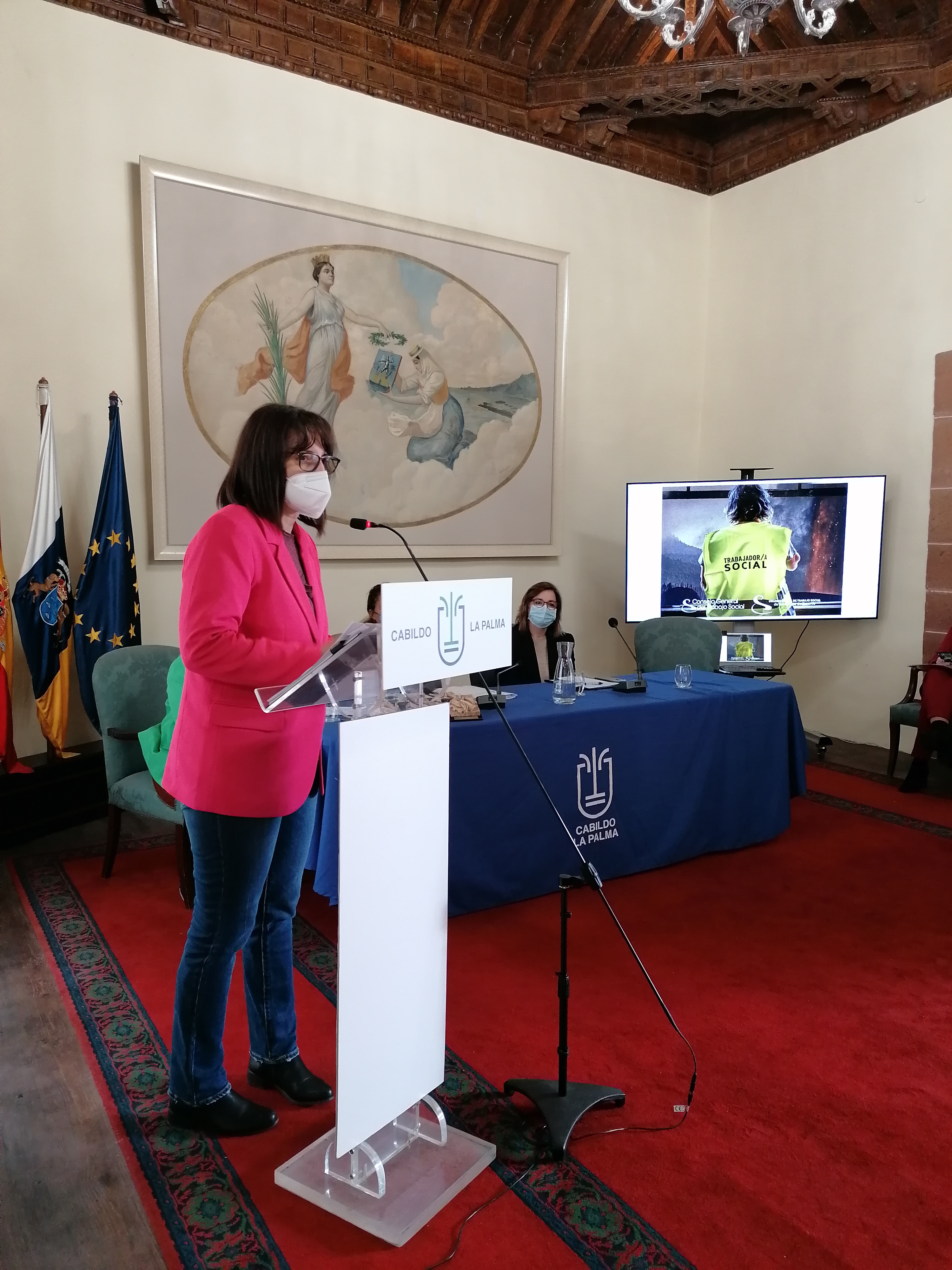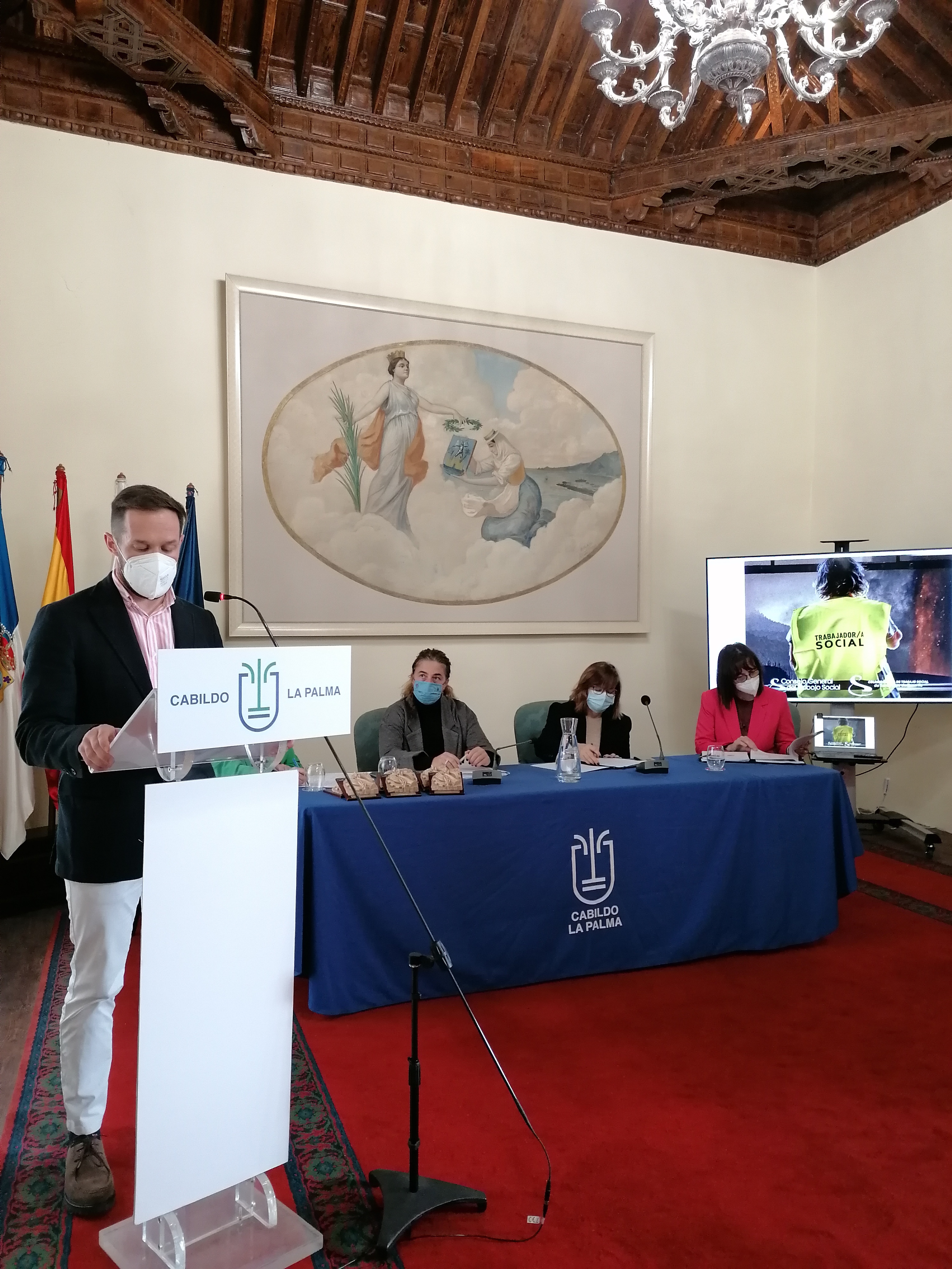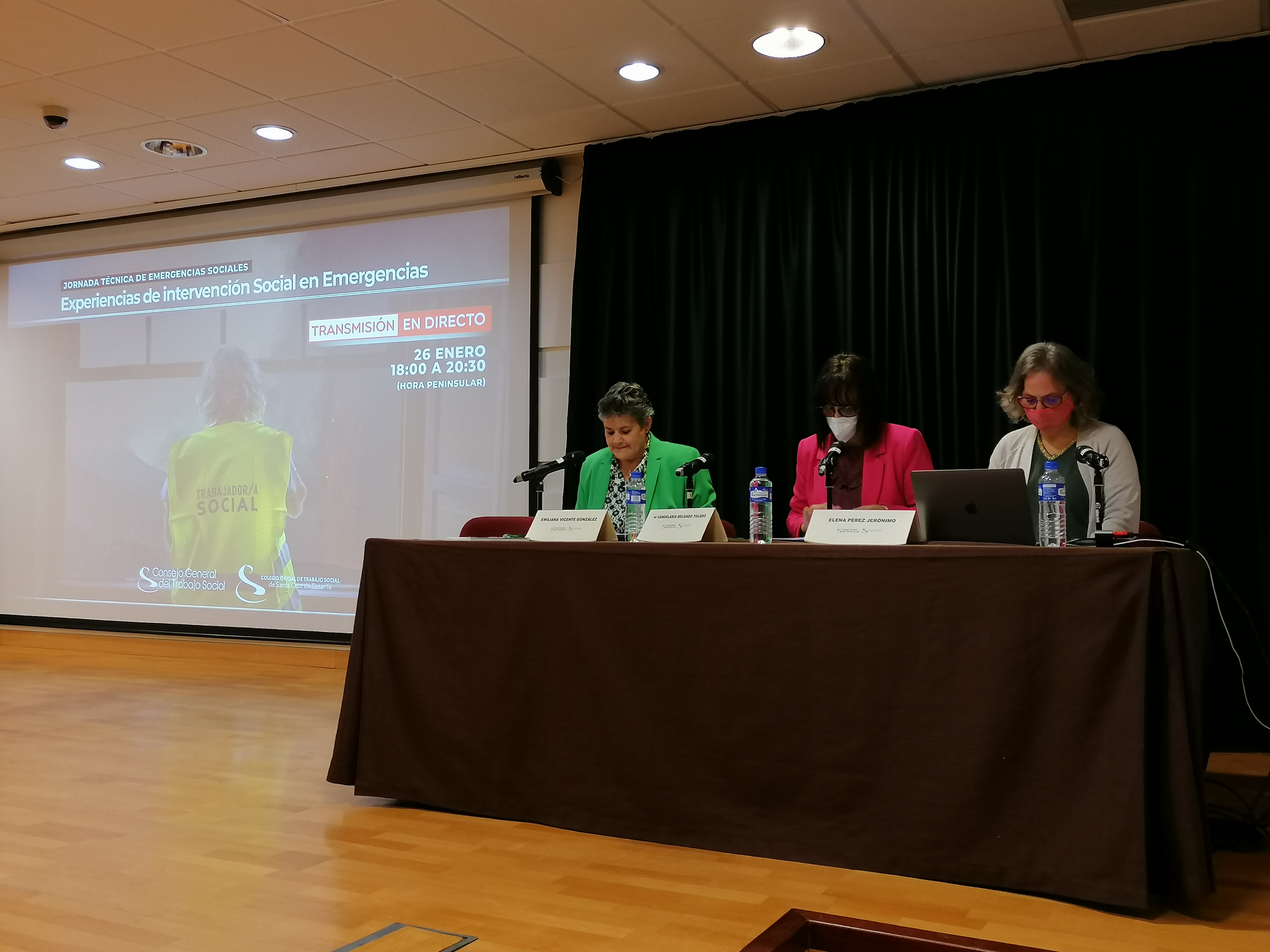 Por la tarde, en colaboración con el Colegio Oficial de Trabajo Social de santa Cruz de Tenerife, se ha organizado en Los Llanos de Aridane, la Jornada Técnica “EXPERIENCIAS DE INTERVENCIÓN SOCIAL EN EMERGENCIAS” para los/as trabajadores/as sociales colegiados en la isla y retransmitida a través del canal de Youtube del Consejo General del Trabajo Social.