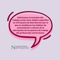 Estando de acuerdo con su propuesta, el Consejo General solicitó el pasado martes a la Secretaría de Estado de Universidades la rectificación inmediata del artículo 2 del Proyecto de Real Decreto, ya que con el ámbito en el que se ha incluido el Trabajo social no se comparte docencia de ningún tipo y no existen puntos de conexión entre los planes de estudio de grado o postgrado correspondiente, entendiendo esto como un error. Por tanto, se ha solicitado la inclusión del Trabajo social como ámbito específico, puesto que de esta manera quedarían claros los conocimientos específicos y propios de nuestra profesión.