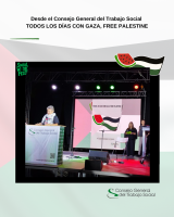 El su discurso, Emiliana Vicente, la Presidenta del CGTS, ha denunciado que no nos acostumbramos al sufrimiento del pueblo palestino y a la tardía reacción de la comunidad internacional, recordando que el Trabajo Social no puede ni debe ser cómplice del silencio: