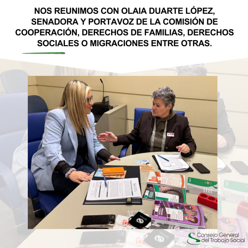 En la reunión con la Senadora, la presidenta del Consejo General del Trabajo Social, Emiliana Vicente, ha trasladado las propuestas del Consejo General en diferentes ámbitos, así como la importancia de generar alianzas con los responsables políticos para garantizar los derechos de la ciudadanía.
