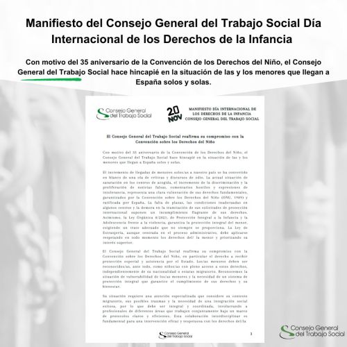 Desde el Consejo General del Trabajo Social hemos publicado un manifiesto con motivo del 35º aniversario de la Convención sobre los Derechos del Niño denunciando la grave situación de vulnerabilidad de los/as menores que llegan solos/as a España. El CGTS exige a las administraciones públicas una respuesta inmediata y efectiva, garantizando la atención integral y el respeto a sus derechos fundamentales.