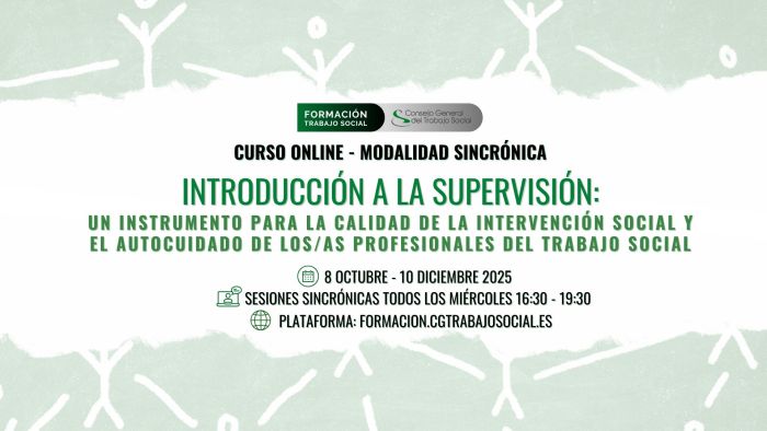 El Consejo General del Trabajo Social lanza la segunda edición del curso “Introducción a la supervisión: un instrumento para la calidad de la intervención social y el autocuidado de los/as profesionales del trabajo social”, con el objetivo de acercar a los/as participantes a los principios básicos, objetivos y metodología de la supervisión profesional y de equipos de Trabajo Social, así como proporcionarles conocimientos que les permitan identificar cuando está indicada la supervisión.