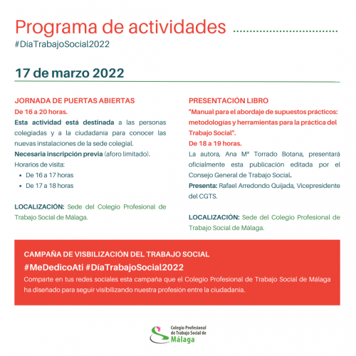 Hoy tendrá lugar la presentación del último libro de Ana Mª Torrado, ‘Manual para el abordaje de supuestos prácticos: metodologías y herramientas para la práctica del Trabajo Social’, organizada por el Colegio Profesional de Trabajo Social de Málaga, a la que acudirá Rafael Arredondo, vicepresidente primero del Consejo General del Trabajo Social.
