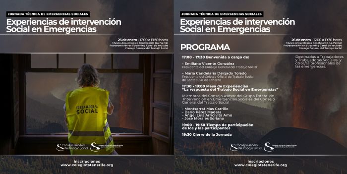 El Consejo General del Trabajo Social y el Colegio Oficial de Trabajo Social de Santa Cruz de Tenerife han organizado la Jornada Técnica – ‘EXPERIENCIAS DE INTERVENCIÓN SOCIAL EN EMERGENCIAS’ que tendrá lugar el próximo 26 de enero en la isla de La Palma y que será retransmitida a través del canal de Youtube del Consejo General del Trabajo Social.