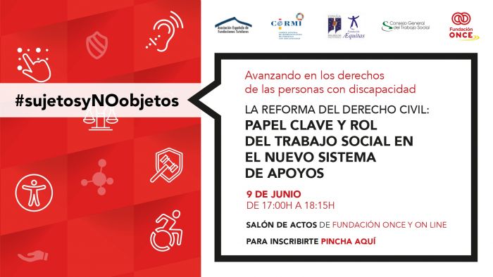 ‘La reforma del Derecho Civil: papel clave y rol del Trabajo Social en el nuevo sistema de apoyos’ es el nuevo webinar que organizamos el próximo miércoles 9 de junio junto con Fundación ONCE, el CERMI, el Consejo General del Notariado y la Fundación Aequitas, sobre la reciente reforma de la legislación civil y procesal en materia de capacidad jurídica. También colabora la la Fundación Española de Fundaciones Tutelares. Este webinar es el segundo encuentro de un ciclo de seminarios diseñado para analizar la reforma legal que modifica la capacidad de obrar de personas con discapacidad, titulado Avanzando en los derechos de las personas con discapacidad’.