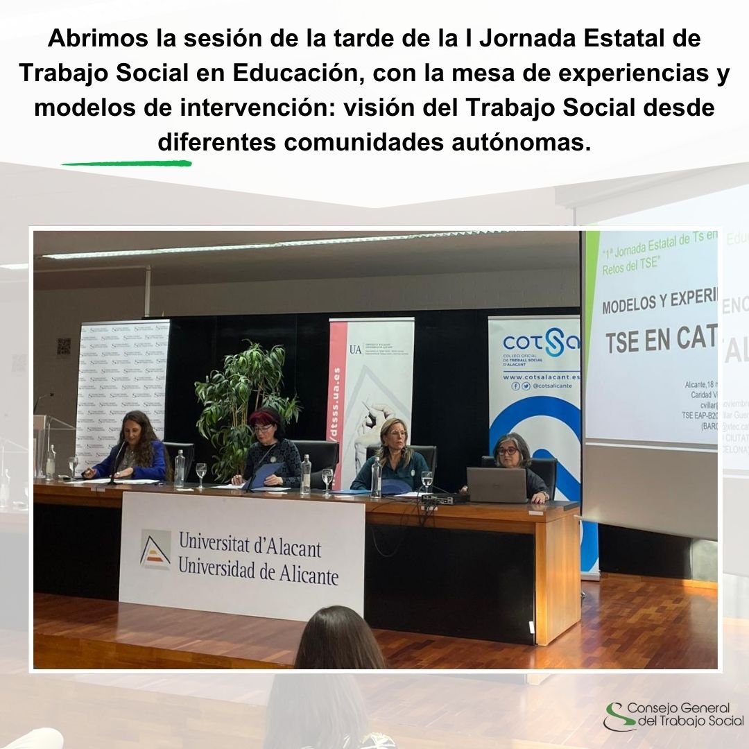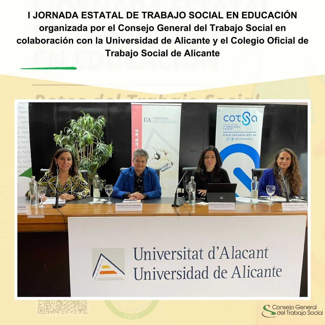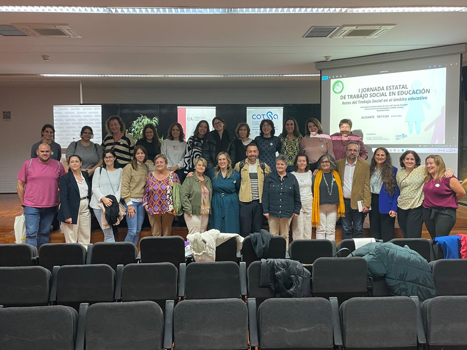 El Consejo General del Trabajo Social con la coparticipación de la Universidad de Alicante, el Departamento de Trabajo Social y Servicios Sociales de la Universidad de Alicante y la colaboración del Colegio de Trabajo Social de Alicante, ha organizado la “I Jornada de Trabajo Social en Educación”; que se celebró el *18 de noviembre de 2024 en Alicante *en modalidad presencial y online. Es la primera vez en la historia del Consejo General del Trabajo Social, que se crea un espacio común donde trabajadoras y trabajadores sociales del ámbito educativo pueden encontrarse, aportar experiencias y crecer. La acogida ha sido un éxito, en torno a doscientas trabajadoras sociales asistieron en distintas modalidades para reflexionar, analizar y ampliar la mirada del trabajo social en educación.