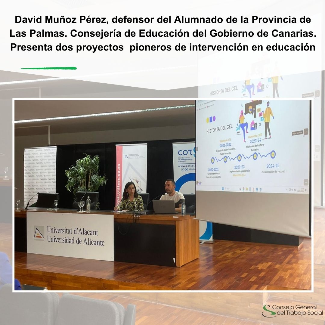 Durante la I Jornada Estatal de Trabajo Social en Educación, hemos conocido “Nuevas Esferas del Trabajo Social” en Educación de la mano de David Muñoz Pérez; Defensor del Alumnado de la Provincia de Las Palmas. Nos ha presentado el Centro de Enseñanzas Lingüísticas (CEL), destinado al alumnado que por problemas de salud no puede asistir en modalidad presencial al centro educativo y que ofrece una alternativa para evitar procesos de absentismo escolar que puedan derivar en un abandono del sistema educativo. Por otro lado, nos ha explicado el funcionamiento de la Oficina de Defensa del Alumnado que además de recoger y asesorar sobre las reclamaciones de los alumnos y alumnas, garantiza los derechos del alumnado y promueve la participación estudiantil a través del fomento de asociaciones estudiantiles.