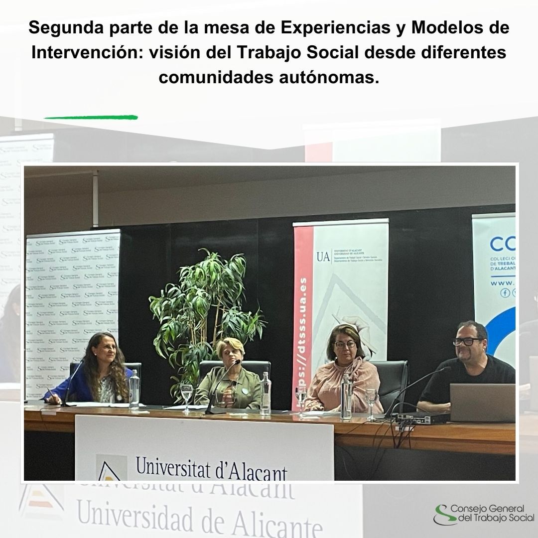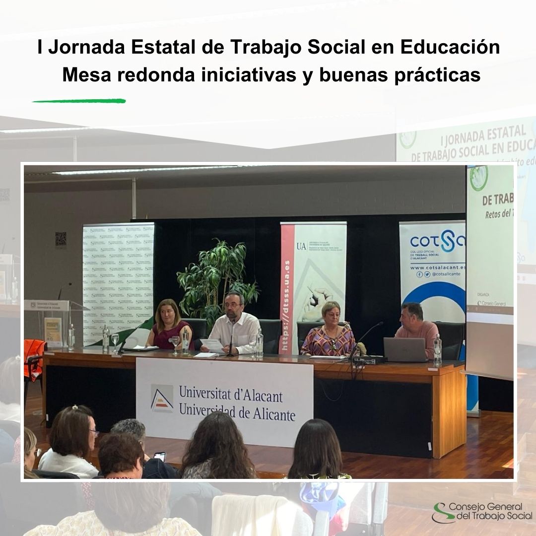 La mesa redonda “Iniciativas y Buenas prácticas”, contó con la moderación de Víctor M. Giménez Bertomeu, director del Dpto. de Trabajo Social y Servicios Sociales de la Universidad de Alicante, en ella, Emiliano Ramírez García, trabajador social de educación del Ayuntamiento de Aspe; Mª Jesús González Fernández, trabajadora social del Ayuntamiento de Mutxamel y Andrea Lago Vidal, trabajadora social y fundadora de BRUJULEANDO, presentaron tres proyectos educativos desde la perspectiva comunitaria respectivamente:Plan de prevención del suicidio desde el contexto escolar, Ciudades Educadoras y Ciudadanía desde el sentir, tres buenas prácticas que inspiran a la profesión con futuros posibles y necesarios para asegurar la calidad de la enseñanza, en los que el trabajo social tiene su reconocimiento dentro del sistema educativo.