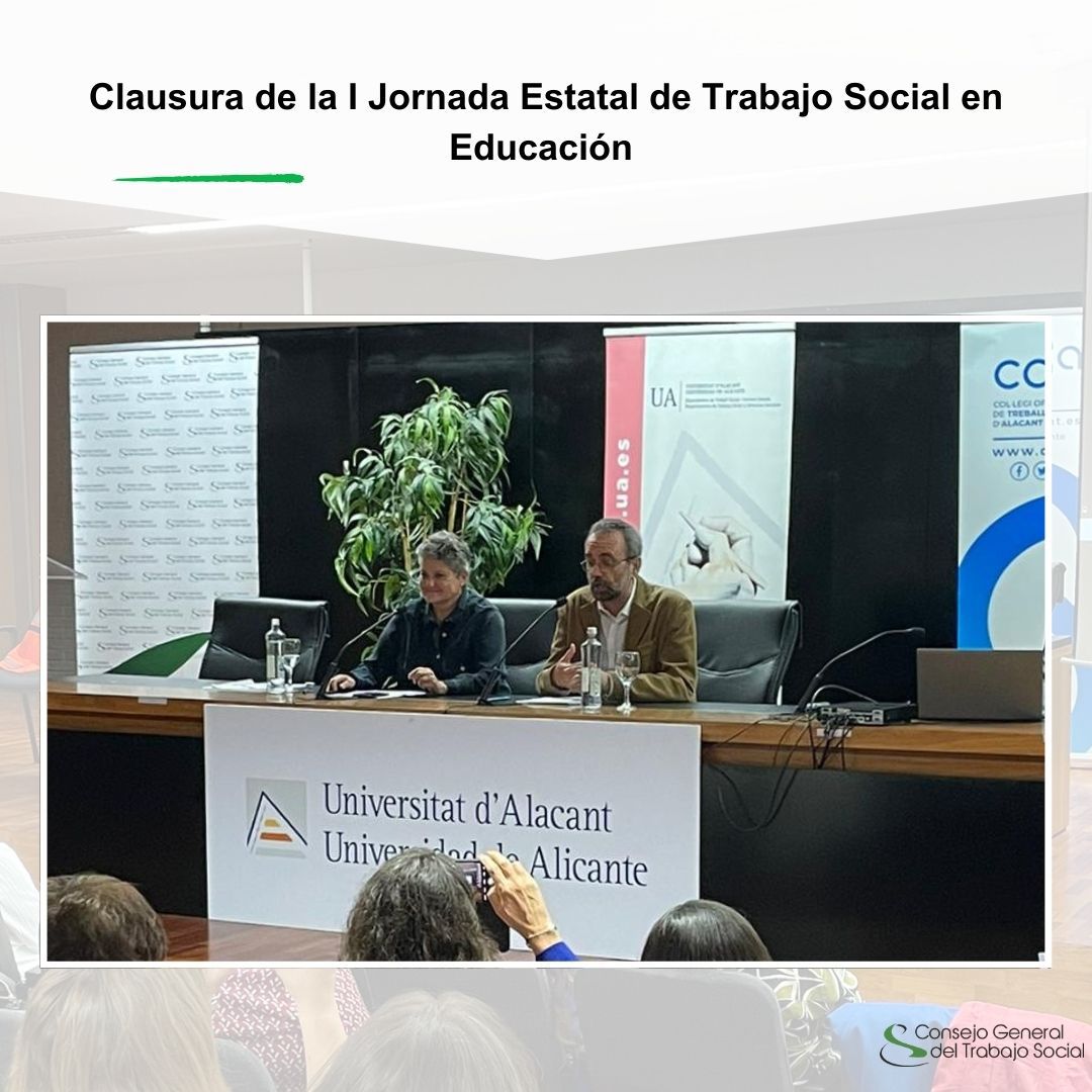 El acto fue clausurado por Víctor M. Giménez Bertomeu, director de Dpo. de Trabajo Social y Servicios Sociales de la Universidad de Alicante y Emiliana Vicente González, presidenta del Consejo General del Trabajo Social, ambos, subrayan la importancia de la alianza entre academia y profesión para enriquecer la disciplina.