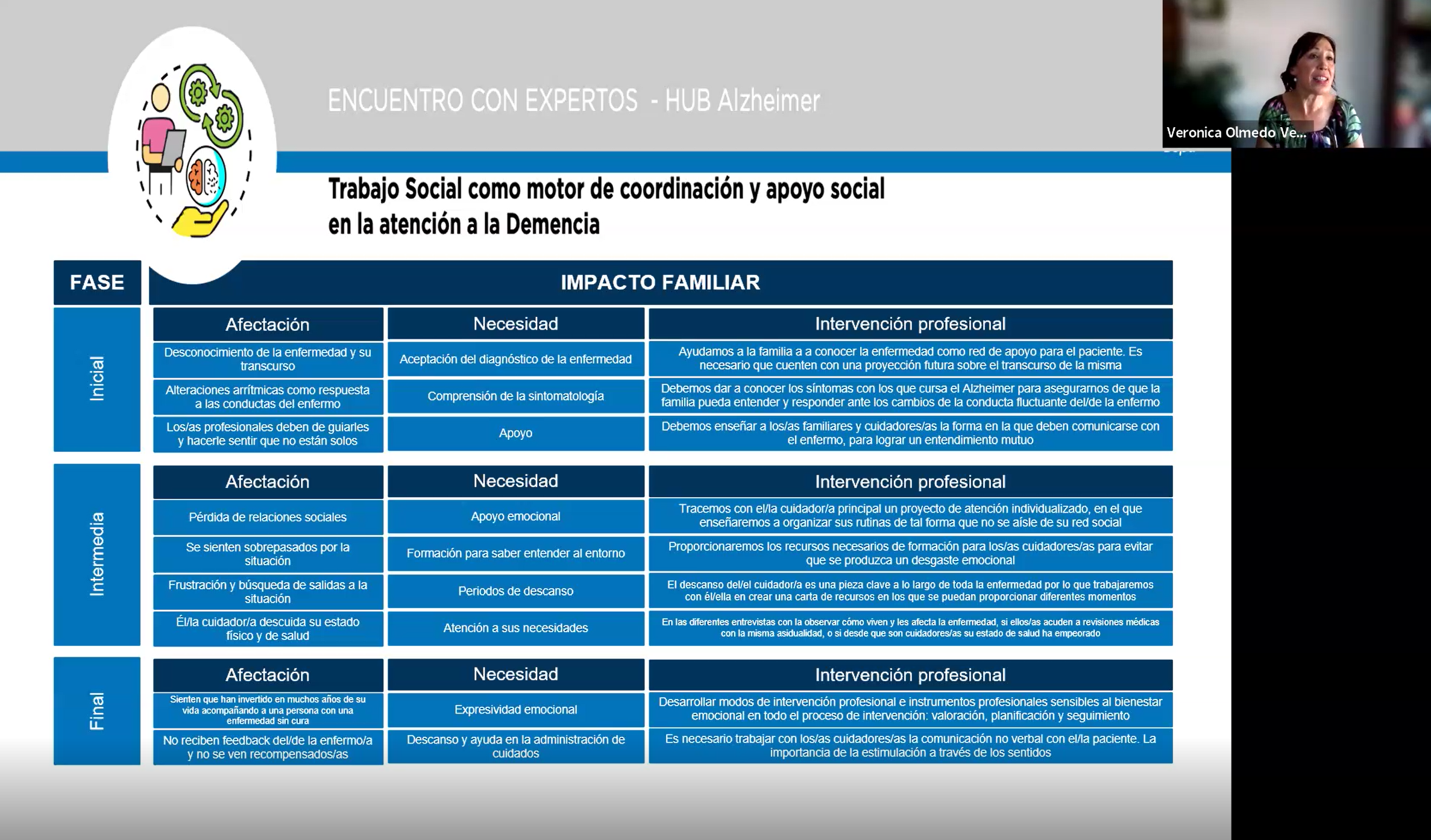 Diferentes expertas en trabajo social han puesto el foco en la intervención específica del trabajo social sanitario, su coordinación con equipos de salud y redes comunitarias, y la necesidad de reforzar su presencia en unidades especializadas como las de deterioro cognitivo.