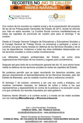 La Cumbre Social, de la que forma parte el Consejo General del Trabajo Social, convoca una manifestación el próximo domingo, 7 de octubre, contra los recortes.