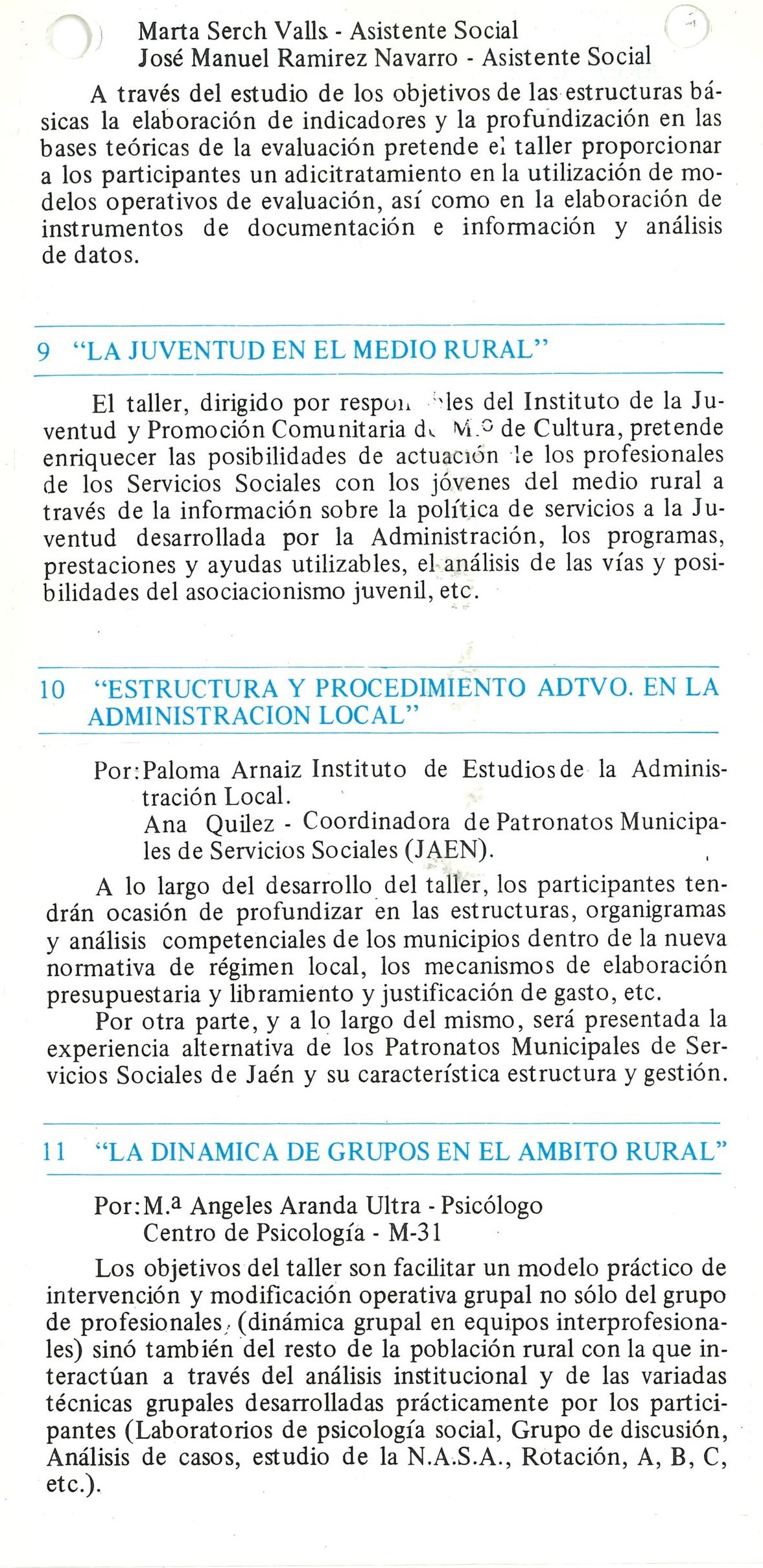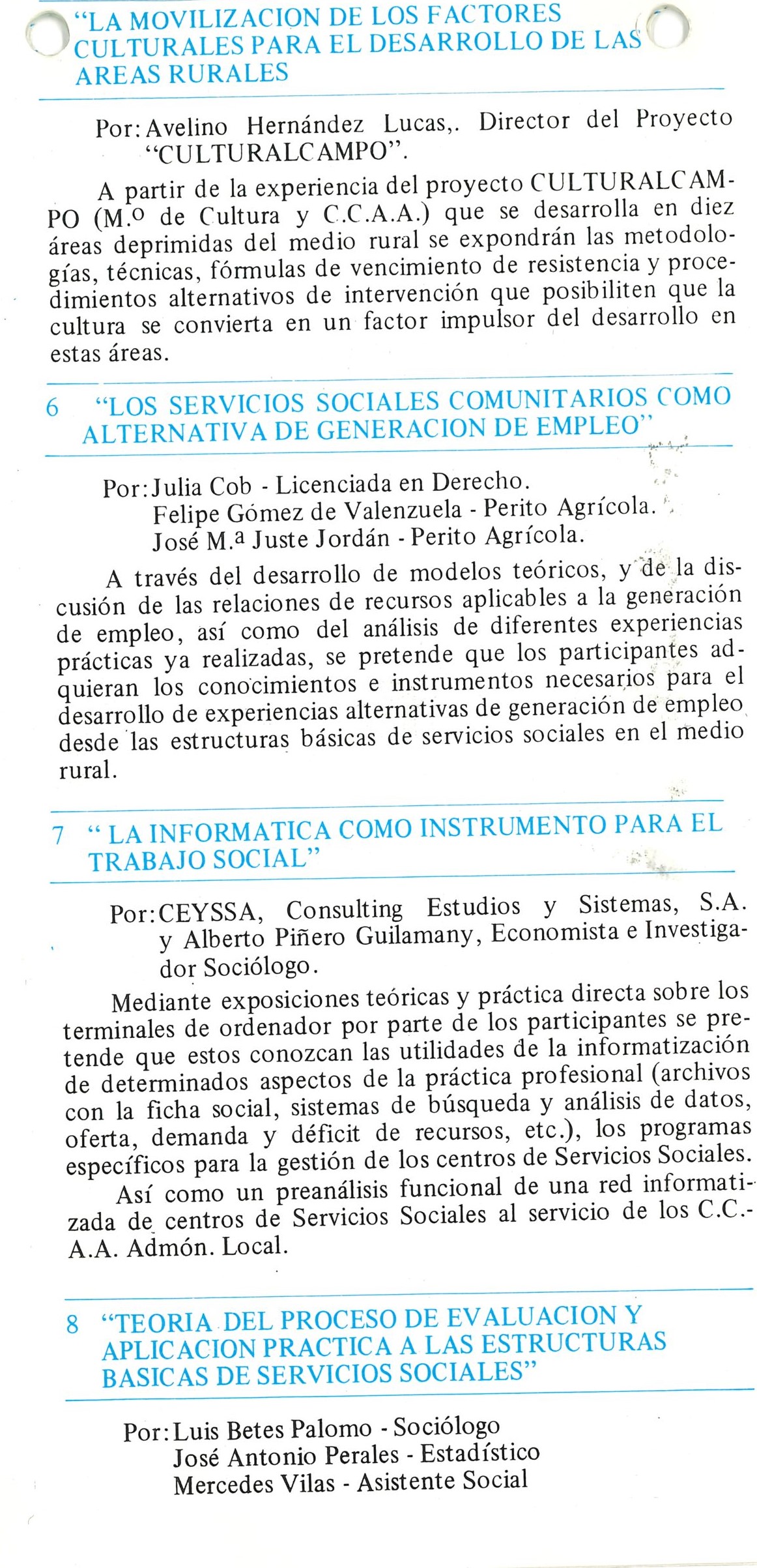 En estas jornadas la actual presidenta del Consejo General del Trabajo Social, Emiliana Vicente, participaba en una de las ponencias junto a dos colegas de profesión más: Begoña Fernández y Margarita Pardo. La ponencia, que tenía como título ‘Modelo organizativo e institucional: tipos de servicios, fórmulas de utilización y equipamientos’, se centraba en la tarea de recopilar y reflexionar sobre los distintos modelos de servicios sociales en el área rural, que hasta el momento funcionaban en cada comunidad autónoma.
