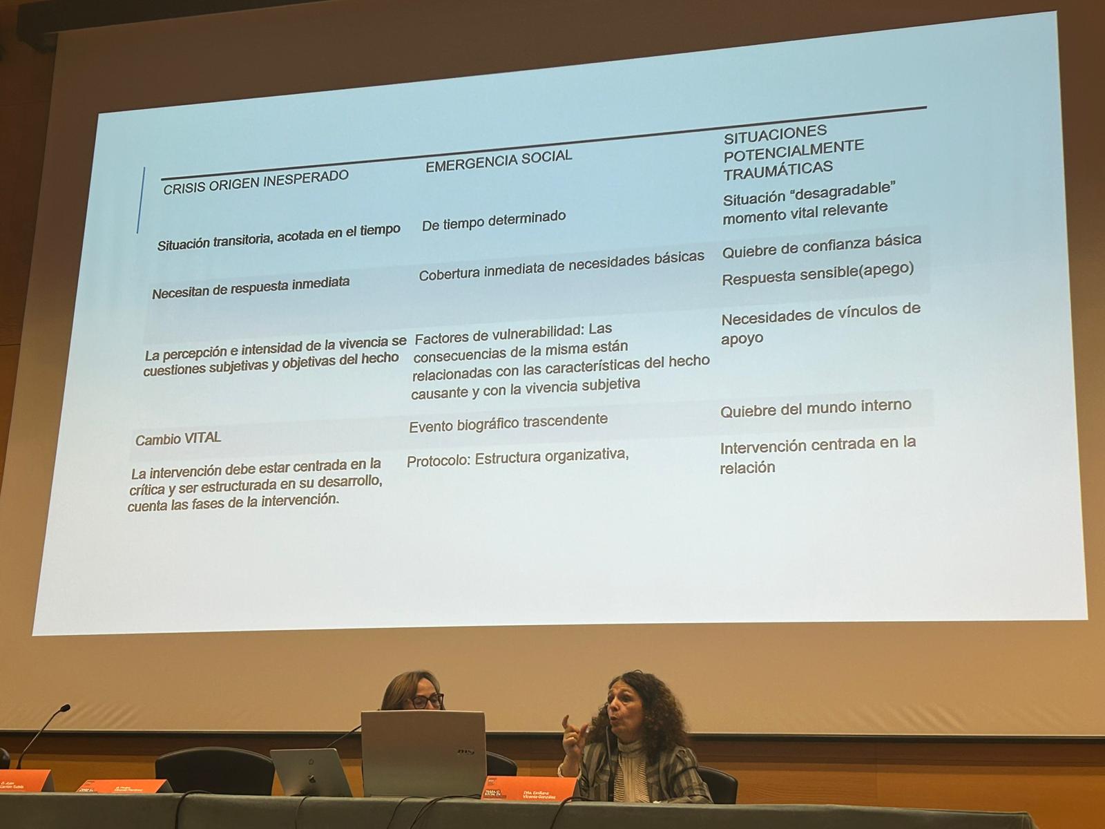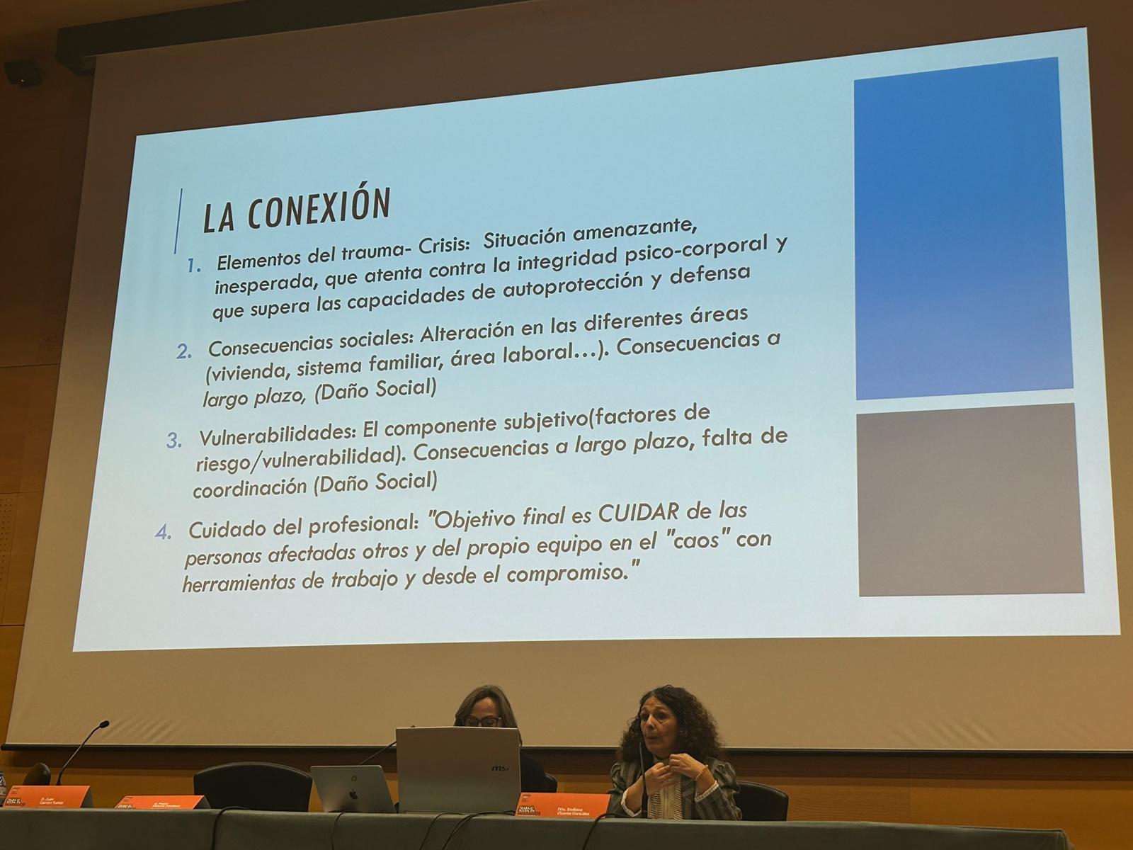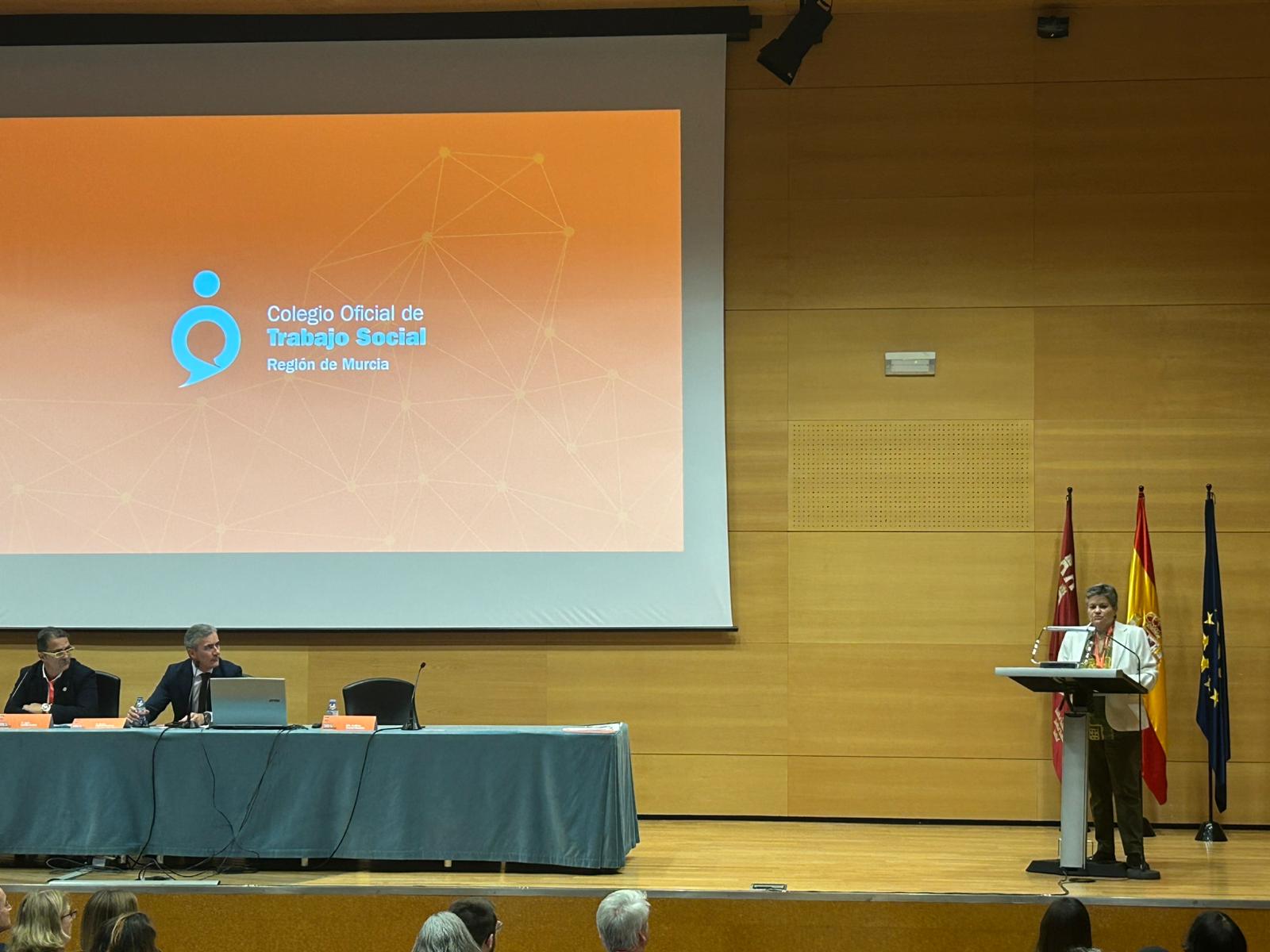 La conferencia inaugural, presentada por Iluminada Pardo Cayuela, vicepresidenta del Colegio Oficial de Trabajo Social de la Región de Murcia, corrió a cargo de Menchu Bernal Pérez, trabajadora social de la Dirección General de Apoyo a Víctimas del Terrorismo del Ministerio del Interior, que resaltó el rol del Trabajo Social como eje vertebrador del análisis de la dimensión y la atención social en situaciones de crisis, urgencias y grandes emergencias, para promover el bienestar y la cohesión social garantizando la cobertura de necesidades básicas y prestando atención a condiciones de vulnerabilidad. Destacó que una situación potencialmente traumática por un delito violento provoca una situación de crisis inesperada, siendo los objetivos de la intervención social: mostrar la función protectora de las administraciones, minimizar el impacto psicosocial producido tras vivir el evento, y respetar y promover las capacidades individuales y familiares de los afectados para su autonomía.