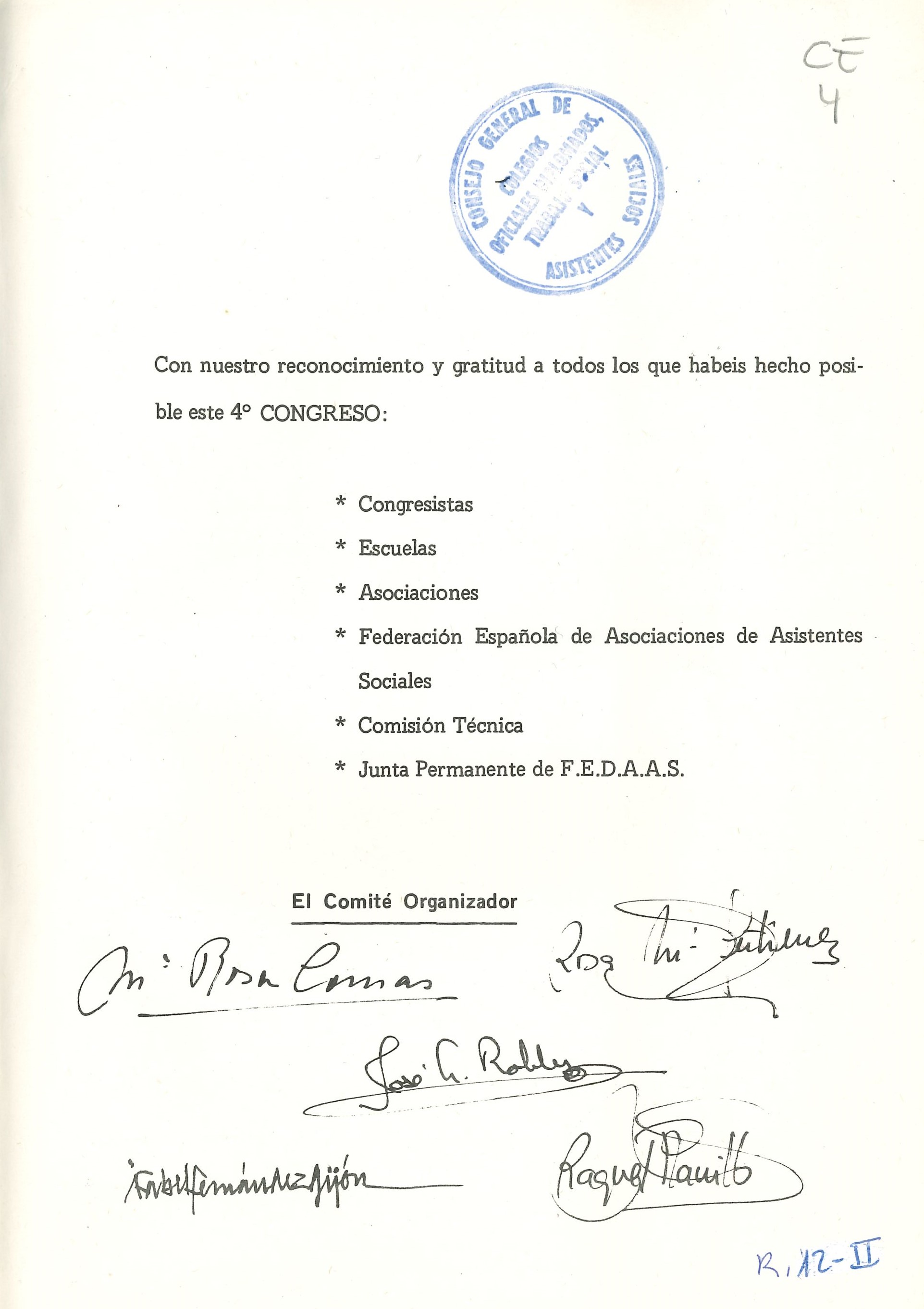“Como resultado de los debates y reuniones de trabajo mantenidos a lo largo del IV Congreso, los Asistentes Sociales, manifiestan ante la opinión pública:
