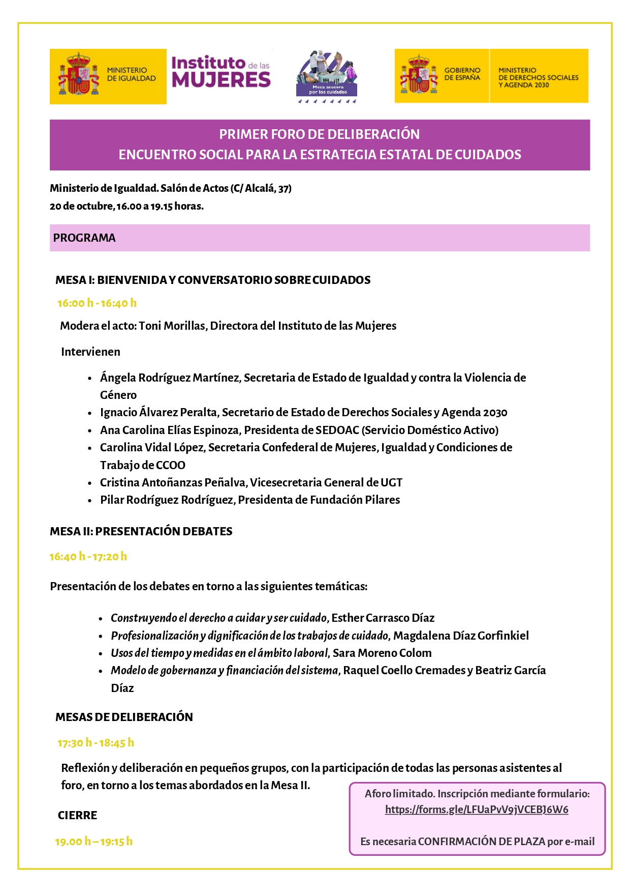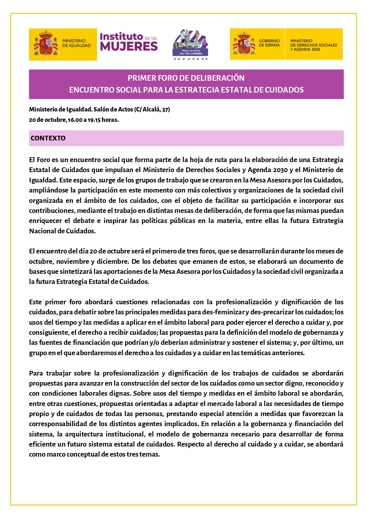 Este encuentro será el primero de tres foros, que se desarrollarán durante los meses de octubre, noviembre y diciembre. De los debates que emanen de estos, se elaborará un documento de bases que sintetizará las aportaciones de la Mesa Asesora por los Cuidados y la sociedad civil organizada a la futura Estrategia Estatal de Cuidados.