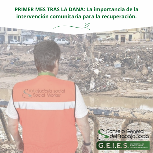 El Consejo General del Trabajo Social movilizó a más de 50 trabajadoras sociales expertas en intervenciones en situaciones de emergencias y grandes catástrofes a través del GEIES (Grupo Estatal de Intervención en Emergencias Sociales), y el Colegio Oficial de Trabajo Social de Valencia coordinó las actuaciones de más de 400 profesionales voluntarias que se pusieron a disposición de los Servicios Sociales de los municipios afectados. En este sentido, la intervención social continúa siendo una prioridad para la recuperación de las personas y las comunidades afectadas.