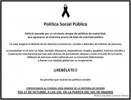 La Alianza contra la Pobreza (formada por más de 140 organizaciones, entre ellas el CGTS) representará el miércoles 17 de octubre el mayor funeral de la historia de España, el funeral de las Políticas Sociales para exigir un cambio, para recordar que los recortes generan pobreza y para mostrar una realidad que la ciudadanía no quiere asumir: