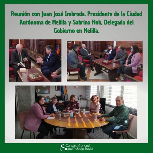 Emiliana Vicente, Presidenta del Consejo General del Trabajo Social, Francisco Jimenez, Vocal del Consejo y Presidente del Colegio Profesional de Trabajo Social de Málaga y Tania Luque, Vicepresidenta del Colegio de Málaga se han reunido con Juan José Imbroda, Presidente de Melilla y con Sabrina Moh, Delegada del Gobierno en la Ciudad Autónoma con el objetivo de mostrar la disposición del Consejo y el Colegio en el acompañamiento de la estructura de la profesión en la Ciudad.