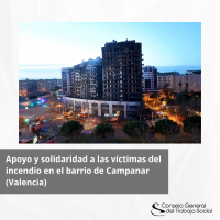 Apoyo y solidaridad a las víctimas del incendio en el barrio de Campanar (Valencia). Tras el incendio sucedido ayer en un complejo de 138 viviendas en el barrio de Campanar en Valencia desde el Consejo General queremos mostrar nuestras condolencias, apoyo y solidaridad a las víctimas, las familias y toda la ciudadanía de Valencia. El trabajo social está interviniendo con las personas afectadas.