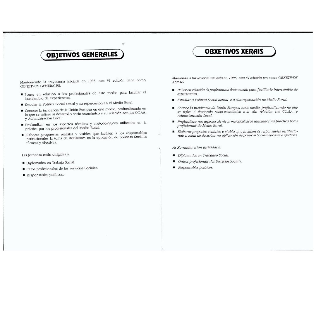 Estas jornadas se celebraron con la colaboración del Colegio Oficial de Trabajo Social de Galicia. La finalidad era la de facilitar a los Trabajadores y Trabajadoras Sociales un espacio para el análisis, la reflexión y el debate sobre las necesidades de la población rural y el trabajo social que se desarrolla, para sistematizar las experiencias y evaluar la adecuación de los recursos a las necesidades.