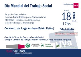 Mesa Redonda: “Arte y Trabajo Social”, a cargo de D. Jorge Arribas, músico, Dª Carmen Ruth Boillos, poeta, Dª Mercedes Herrero, creadora escénica y* Dª Verónica Serrada,* dramaturga, que tendrá lugar el lunes 18 de Marzo en cooperación con la Universidad de Valladolid, gracias al convenio suscrito recientemente, que todos los colegiados/as y ciudadanos podrán disfrutar en formato presencial y a través de conexión Online en directo a las 17:00h con el salón de grados de la Facultad de Educación y Trabajo Social de la UVA.