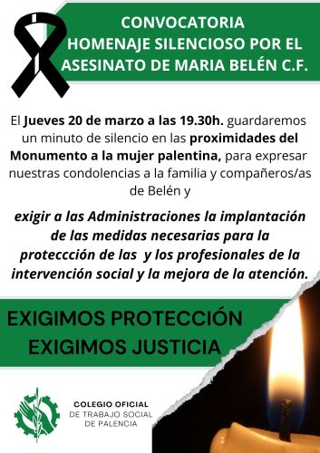 El próximo Jueves 20 de marzo a las 19.30h en las proximidades del Monumento a la mujer palentina, haremos un minuto de silencio en señal de respeto a todos y todas las profesionales de la intervención social y de forma particular por Belén.