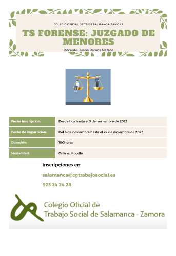 Horariodel lunes 06 de Noviembre al viernes 22 de Diciembre de 2023Esta acción formativa pretende realizar un acercamiento teórico – práctico a un ámbito del Trabajo Social especializado , el Trabajo Social forense, que necesita de un conocimiento básico legislativo y de organización de tribunales para posibilitar la práctica profesional que se resume en asesoramiento a jueces y fiscales en su toma de decisiones .