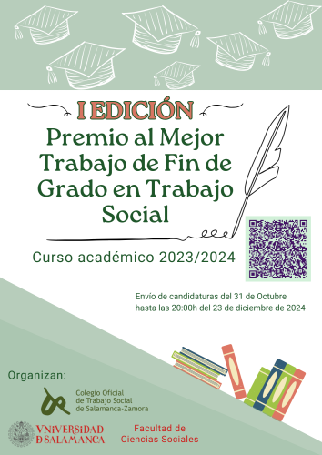 El Colegio Oficial de Trabajo Social de Salamanca-Zamora (COTSSaZa, en adelante) en colaboración con la Facultad de Ciencias Sociales de la Universidad de Salamanca (USAL) y la Coordinación del Grado en Trabajo Social, convoca la Primera Edición del Premio al Mejor Trabajo de Fin de Grado en Trabajo Social, defendido durante el curso académico 2023/2024 en la Universidad de Salamanca.