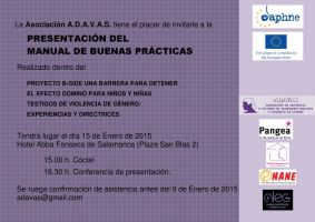 ADAVAS Salamanca presentará el Manual de buenas prácticas: PROYECTO B-SIDE UNA BARRERA PARA DETENER EL EFECTO DOMINÓ PARA NIÑOS Y NIÑAS TESTIGOS DE VIOLENCIA DE GÉNERO: EXPERIENCIAS Y DIRECTRICES-